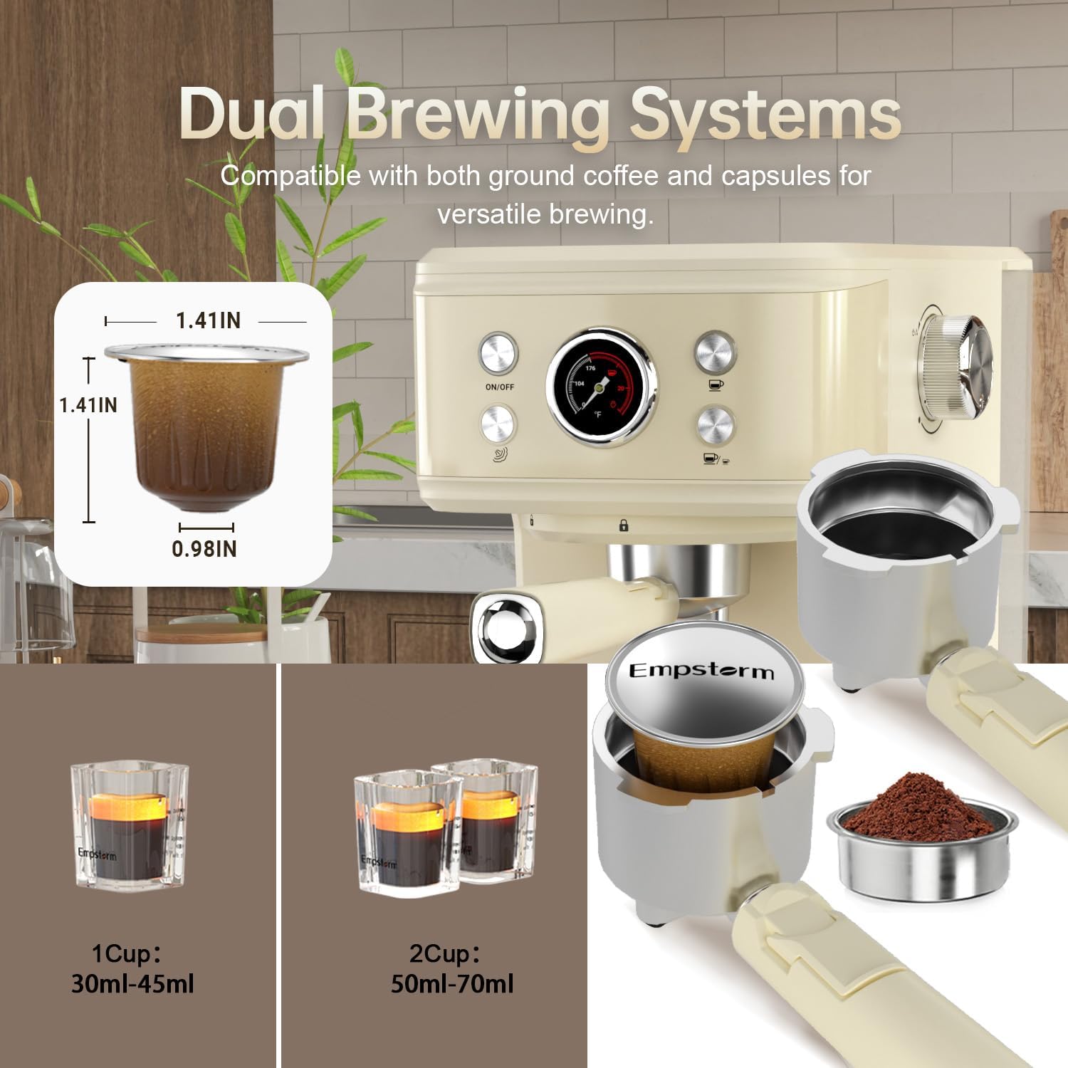 - ☕【2 in 1 Extraction】- This espresso coffee machine comes with two Portafilters that can be used for coffee powder and capsule coffee. Cup warmer on top to preheat cups for longer heat retention. Attention: Not compatible with all capsule sizes and does not include capsules.