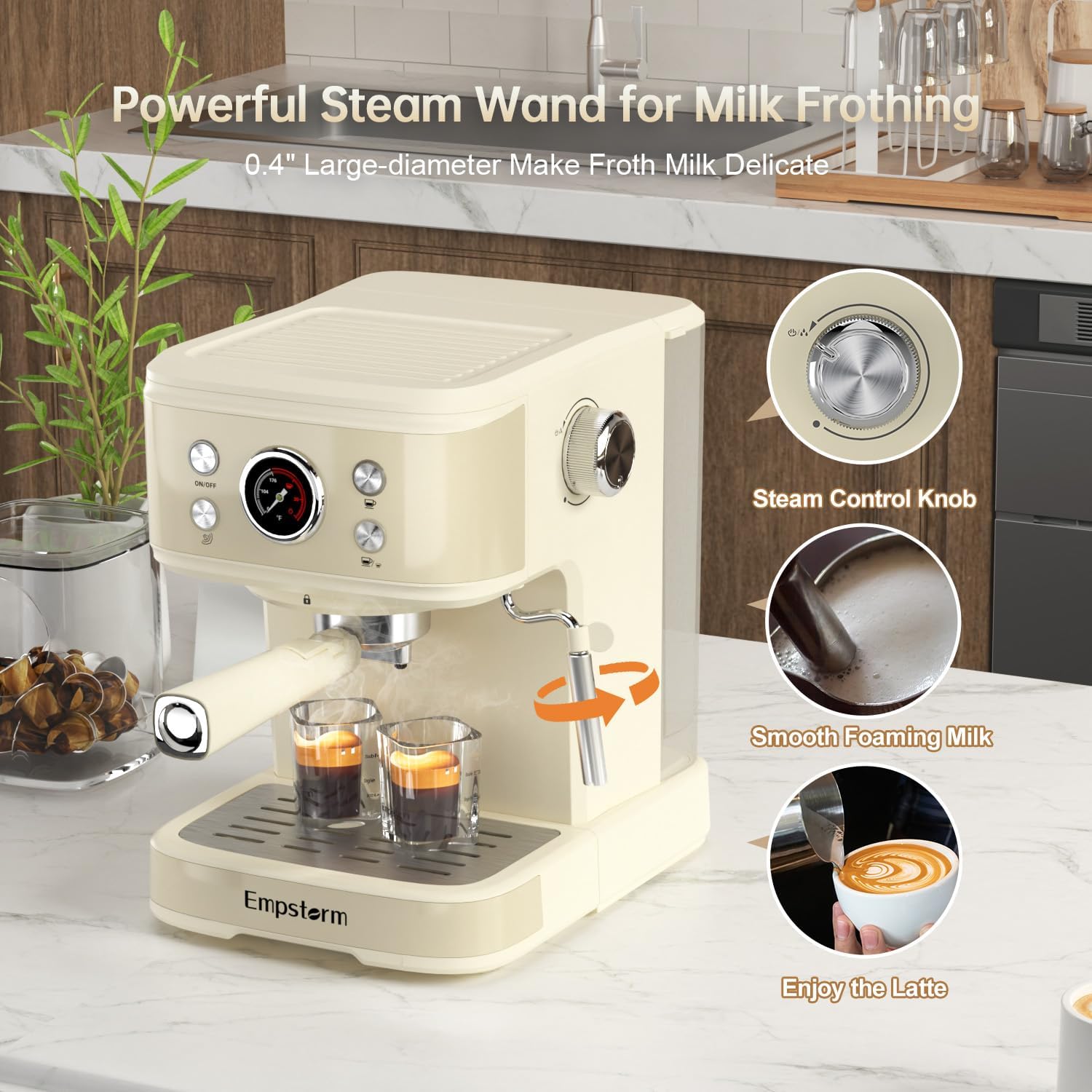 - 🥛【Steam Wand】- 360° adjustable steam wand creates smooth, creamy froth for lattes/cappuccinos in ≤60s at home or in the office. Removable nozzle for easy cleaning. With thermometer dial for easy viewing.