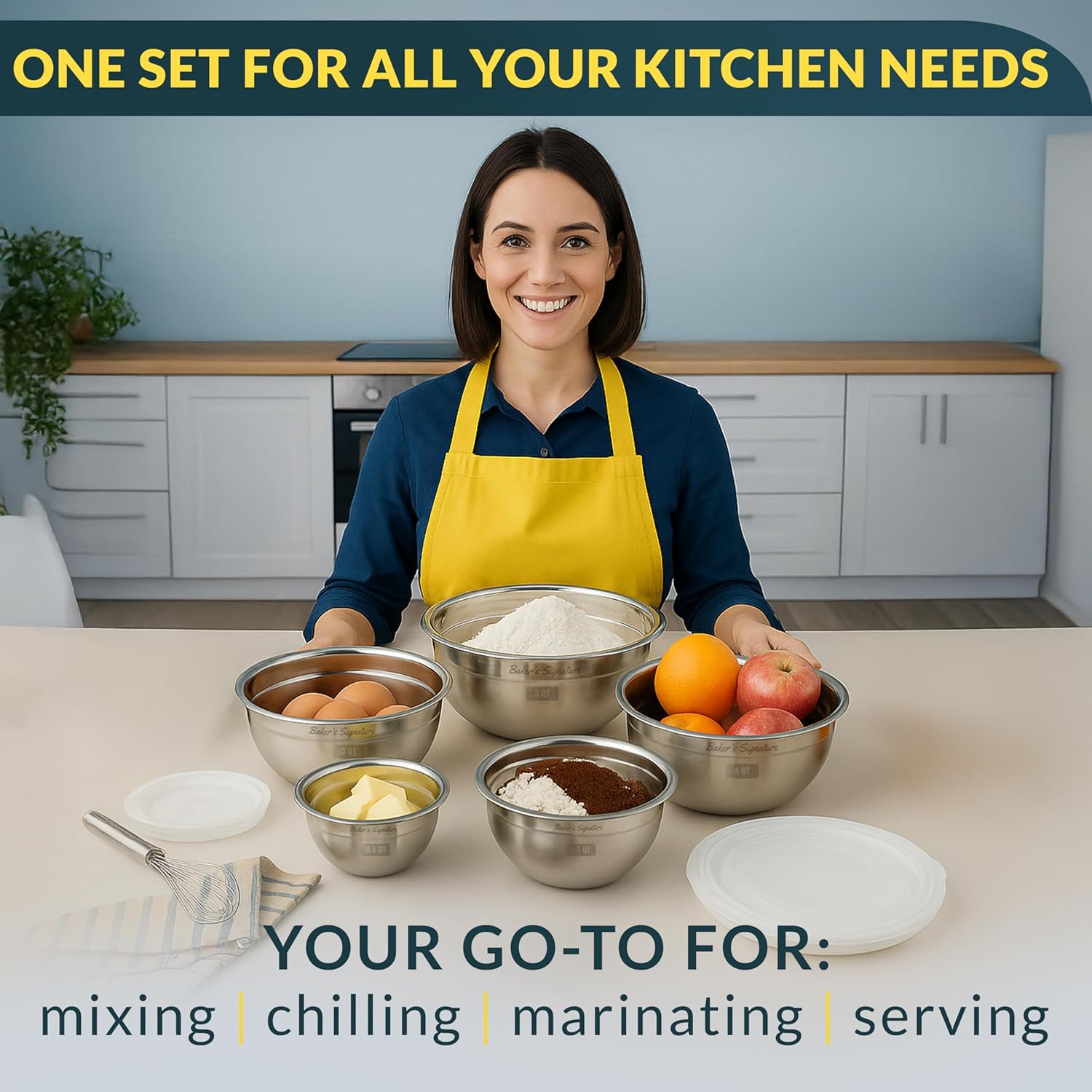 Baker's Signature Stainless Steel Mixing Bowls With Lid, Metal Mixing Bowl Set Of 5, Nesting Set For Food Prep, Baking,Storage, Cooking, Serving | Dishwasher Safe, 0.5/1.5/3/4/5 Qt