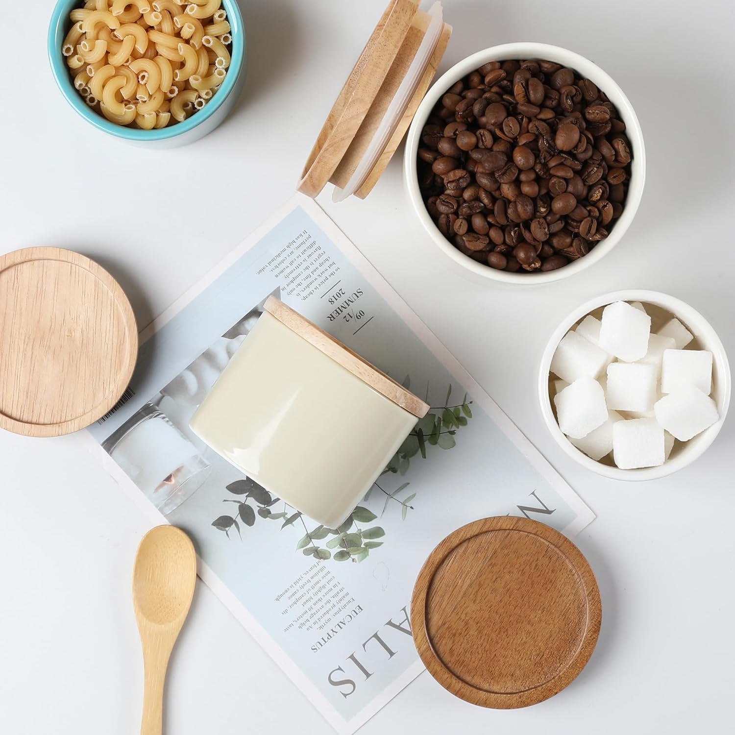 Sweejar Kitchen Canisters Ceramic Food Storage Jar, Stackable Containers with Airtight Seal Wooden Lid for Serving Ground Coffee, Tea, Sugar, Spice and More - 5 Fl Oz(Beige)