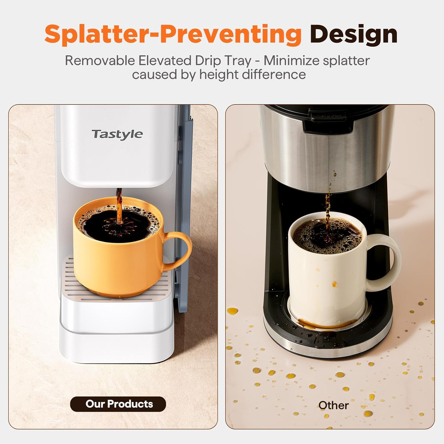 - Splatter-Preventing & Travel Mug Friendly: Included a removable elevated drip tray to prevent splatter from height differences when dripping. Fits various cup heights, up to a 7.3" travel mug