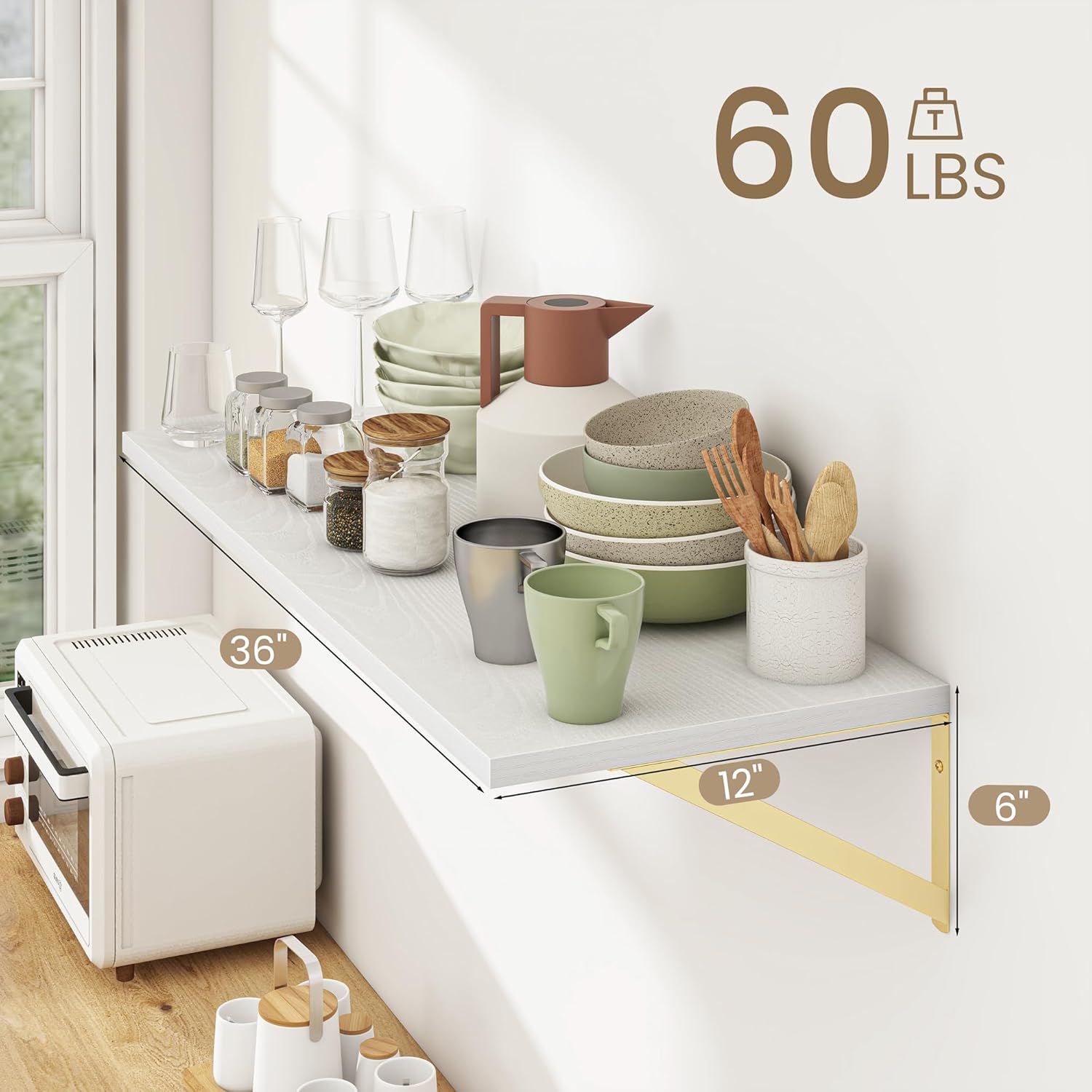 - Large Floating Shelves: Our versatile rustic wall shelves measure 36&12 inch floating shelves, offering generous storage or display space for any room in your home—be it the kitchen, living room, bedroom, bathroom, laundry room, and so on. With ample surface area, you can easily store or display items like books, collectibles, plants, crafts, photos, laundry supplies, and more.