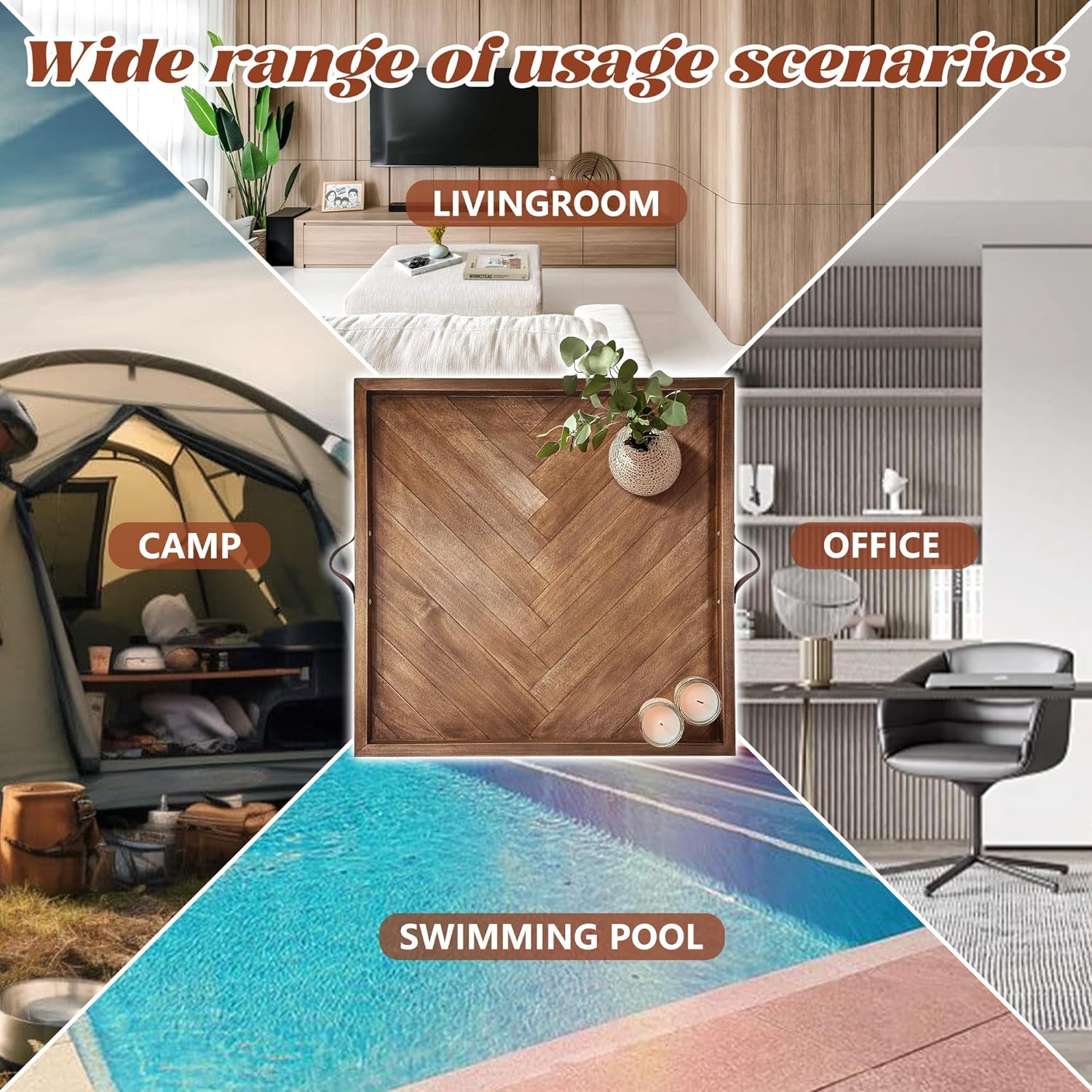 - 【Generously Spacious】With the Large size of 24x24x1.6in, designed with practicality in mind, our tray features a large surface area and a deep, sturdy frame, making it the perfect solution for both decorative and functional use. Whether you're serving breakfast, organizing magazines, or displaying candles and plants, this tray has the capacity and durability to handle it all. The solid wood construction ensures lasting durability, while the genuine leather handles offer a comfortable, stylish grip for easy carrying.