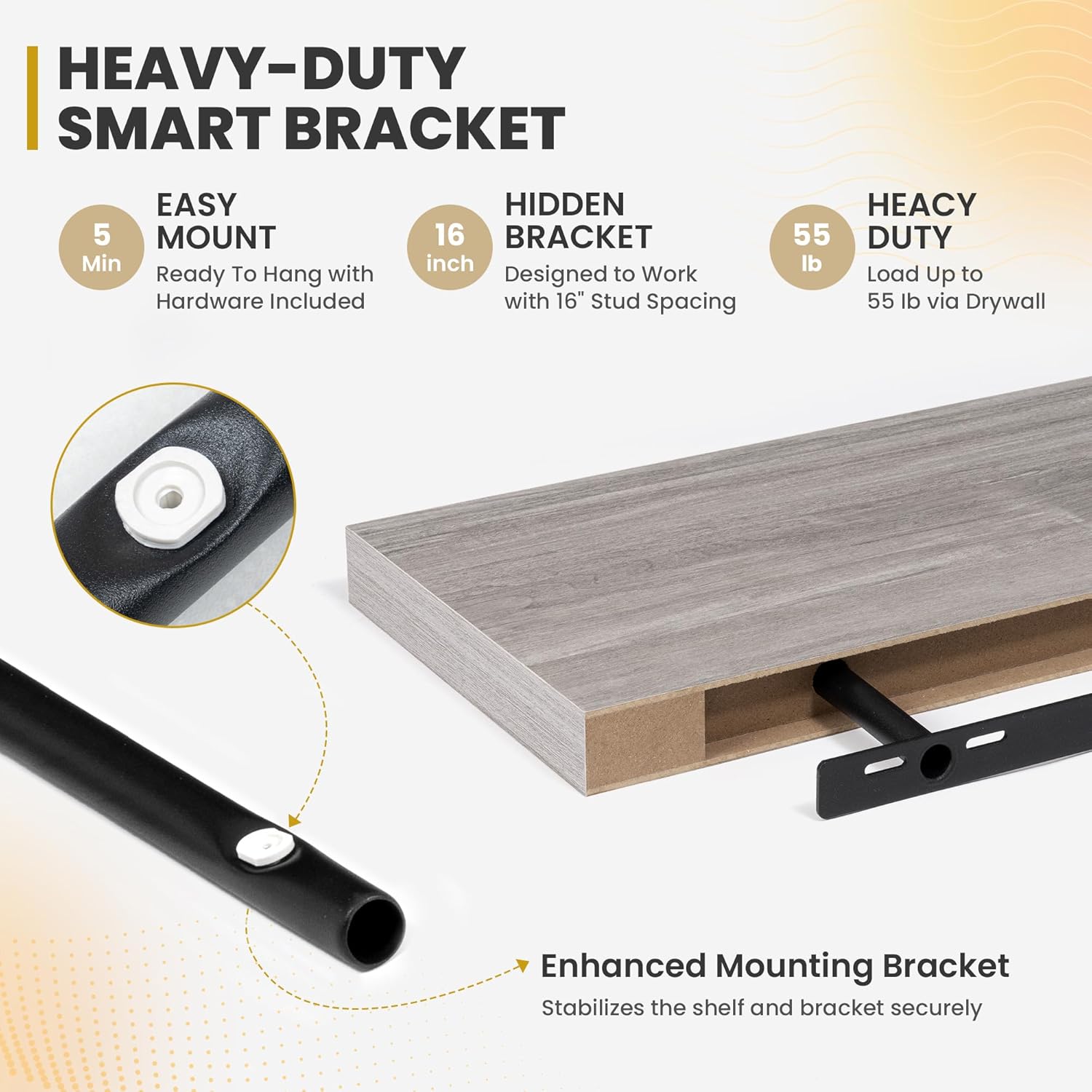 - [QUICK INSTALLATION WITH DETAILED GUIDES]: Our floating shelves include all mounting hardware and a comprehensive guide, enabling quick setup in under 10 minutes. Follow the step-by-step instructions to enjoy these beautiful shelves effortlessly, instantly upgrading your living space.