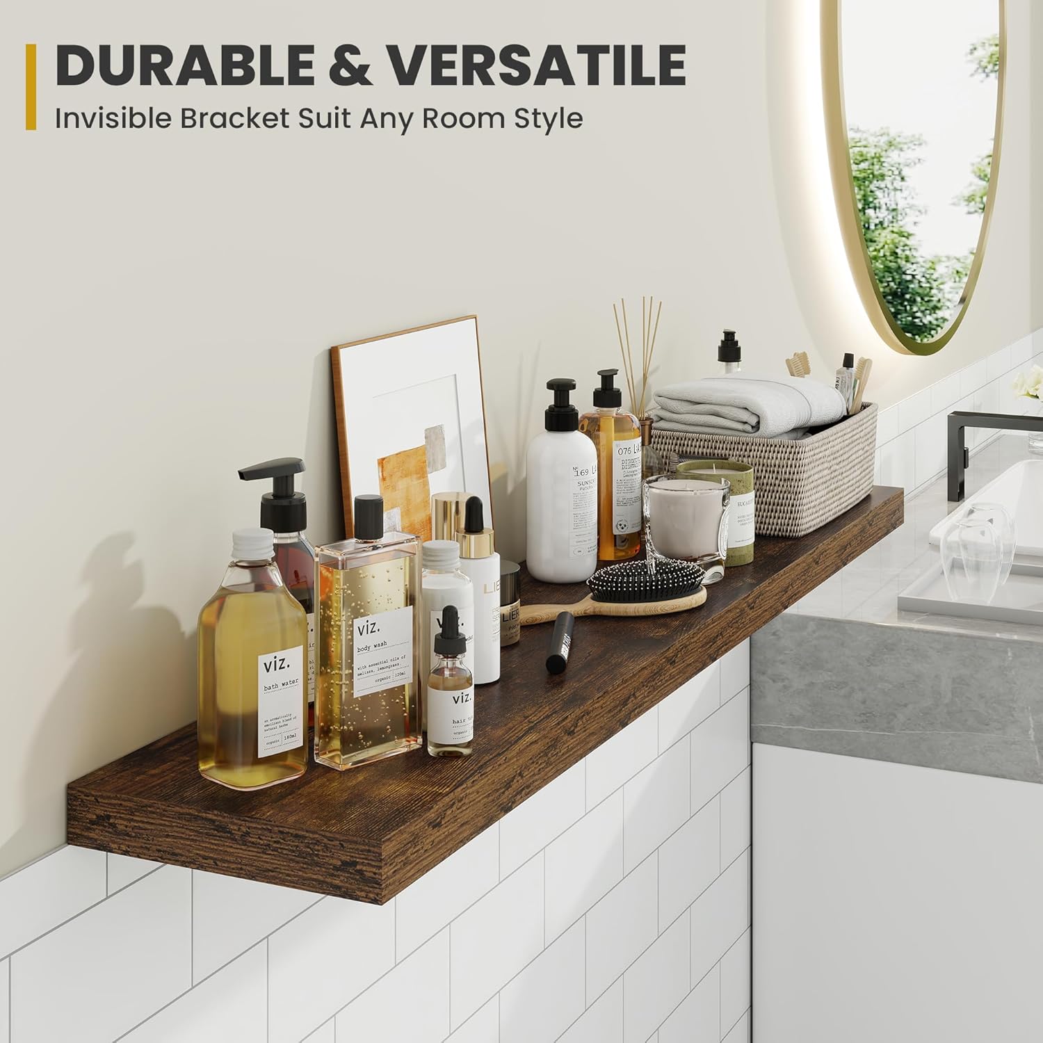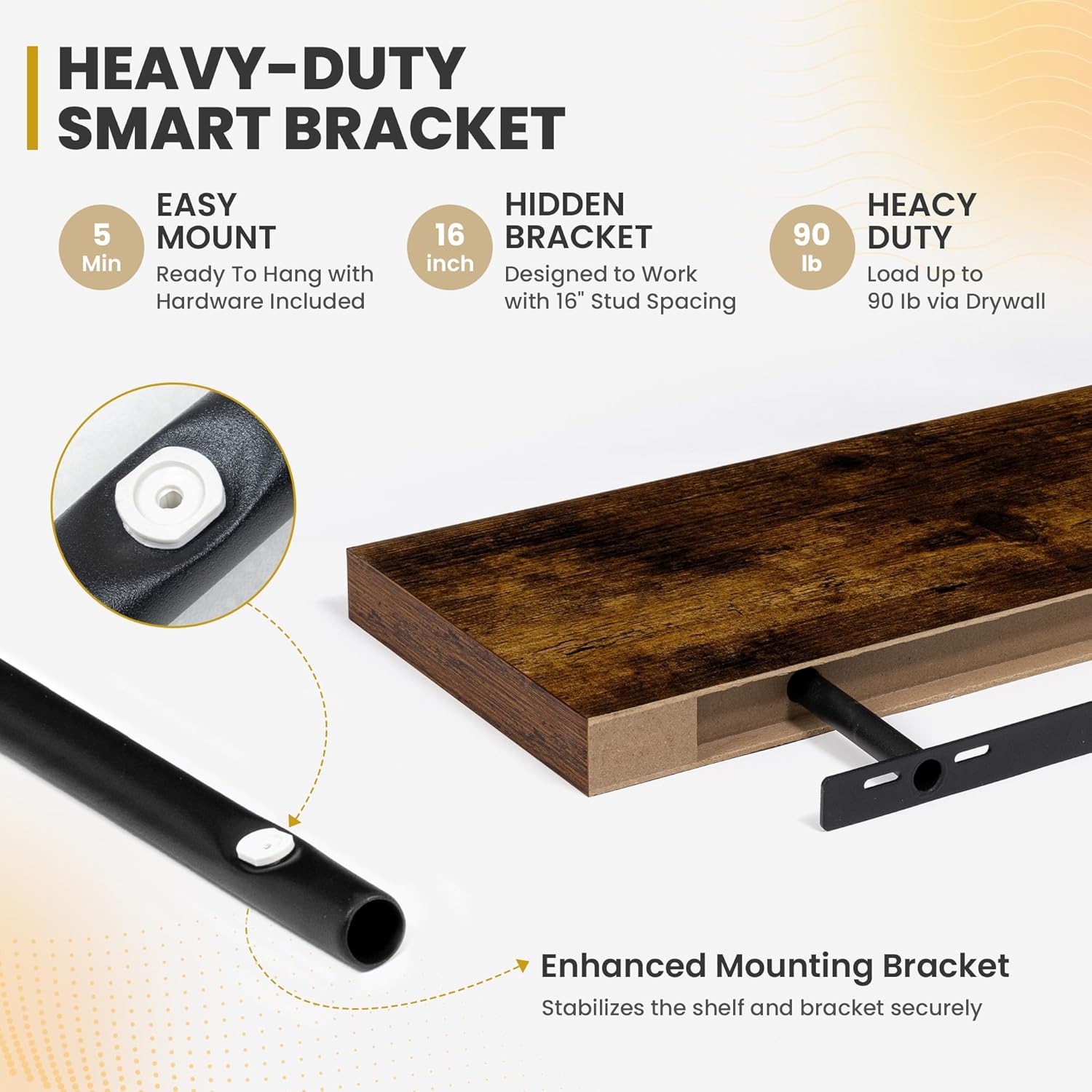 - [ROBUST & SECURE MOUNTING]: Equipped with a sturdy, hidden mounting bracket, these 55-inch floating shelves ensure solid support for your items. Designed for easy and secure installation, they come with all necessary hardware for a firm, wobble-free setup, allowing you to confidently display decor, photos, or functional items with style.