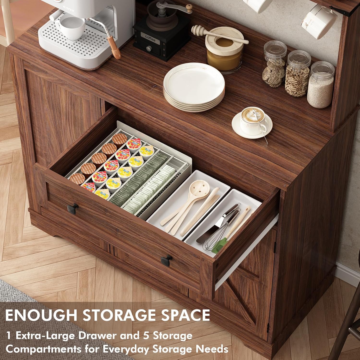 Wnutress Farmhouse Coffee Bar Cabinet with Drawer, 39" Kitchen Hutch Sideboard Buffet Cabinet with Charging Station and Adjustable Shelves, Coffee Bar Storage Table for Living Room, Dining Room, Brown