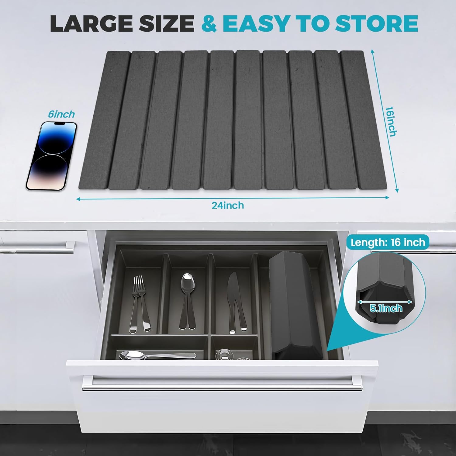 - Collapsible stone drying mat for kitchen counter: Measuring 24"(L)x16"(W) when unfolded, this collapsible stone drying mat offers ample space for your dishes. When not in use, easily store it in drawers or kitchen cabinets, maximizing your kitchen's organization