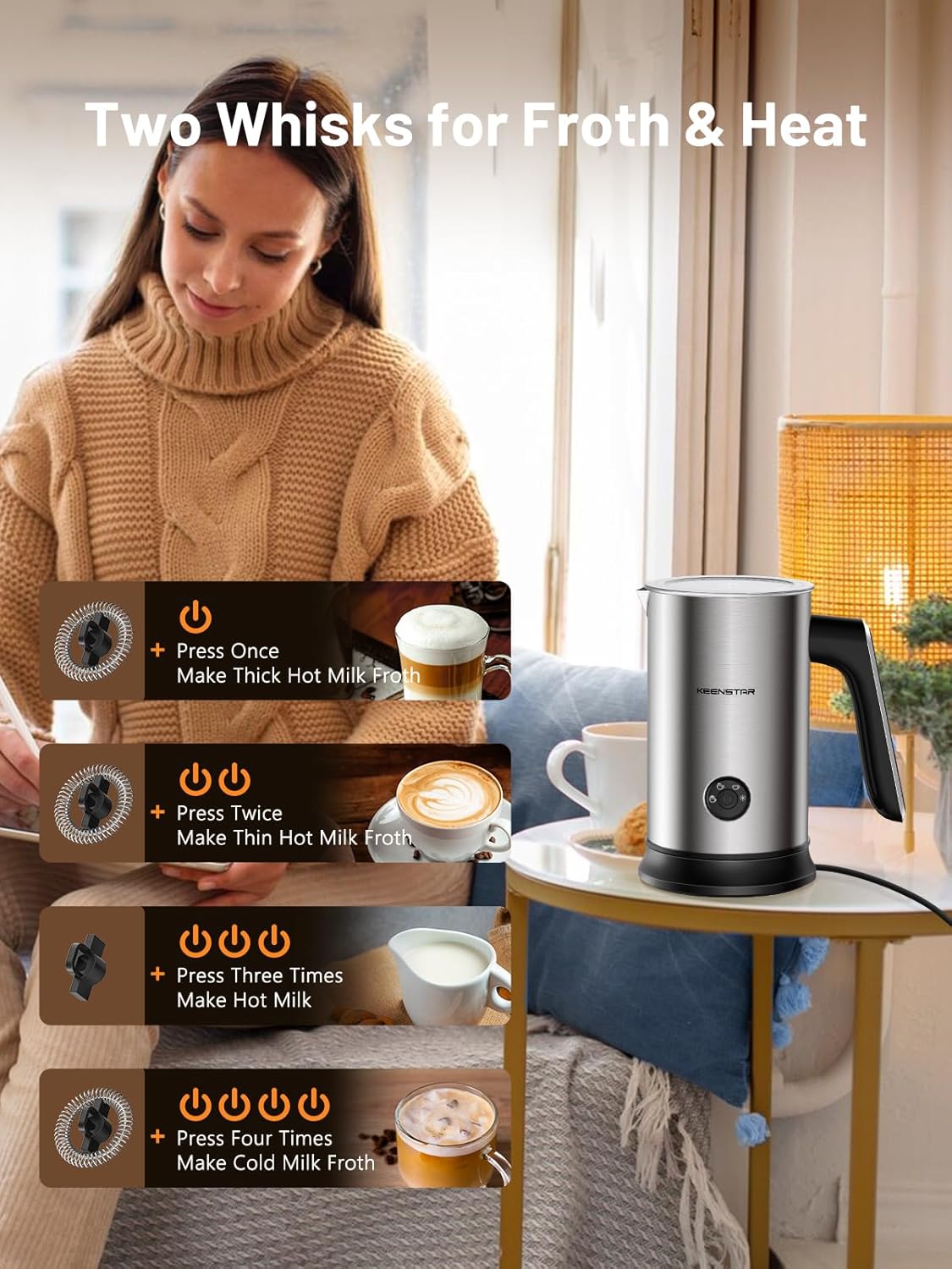 - 【4-1 Multifunctional Milk Frother】The 4-in-1 milk frother could make cold foam, warm light foam, warm thick foam, and warm milk or chocolate without foaming. It is recommended to use milk with a fat content greater than 3% for better results.