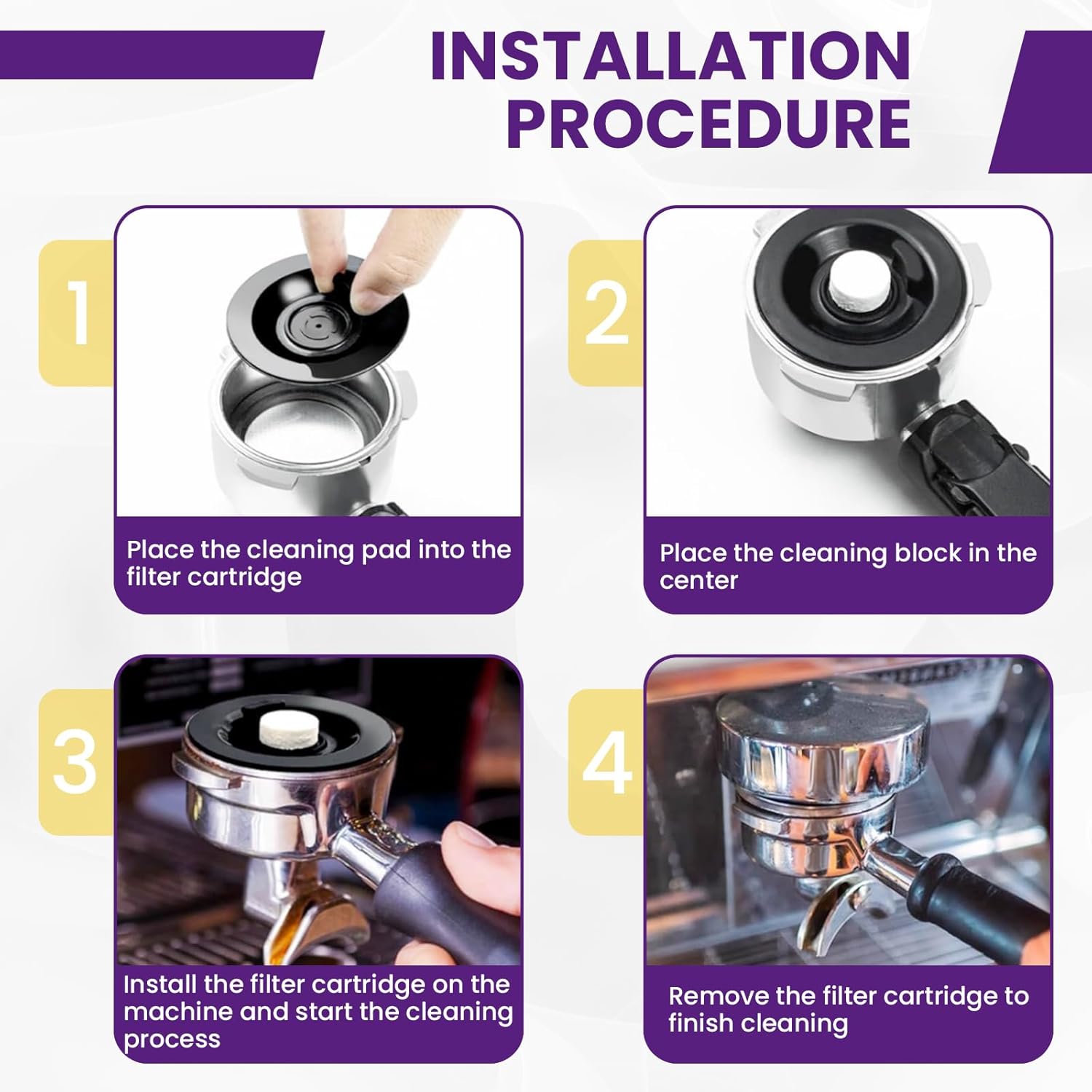 - 𝐄𝐚𝐬𝐲 𝐈𝐧𝐬𝐭𝐚𝐥𝐥𝐚𝐭𝐢𝐨𝐧: The 54mm backflush disc is easy to install. Simply remove the metal coffee filter from the espresso handle, place the blind disk inside, add the cleaning agent, reattach the handle, and then turn on the coffee machine's extraction button to clean the valve system