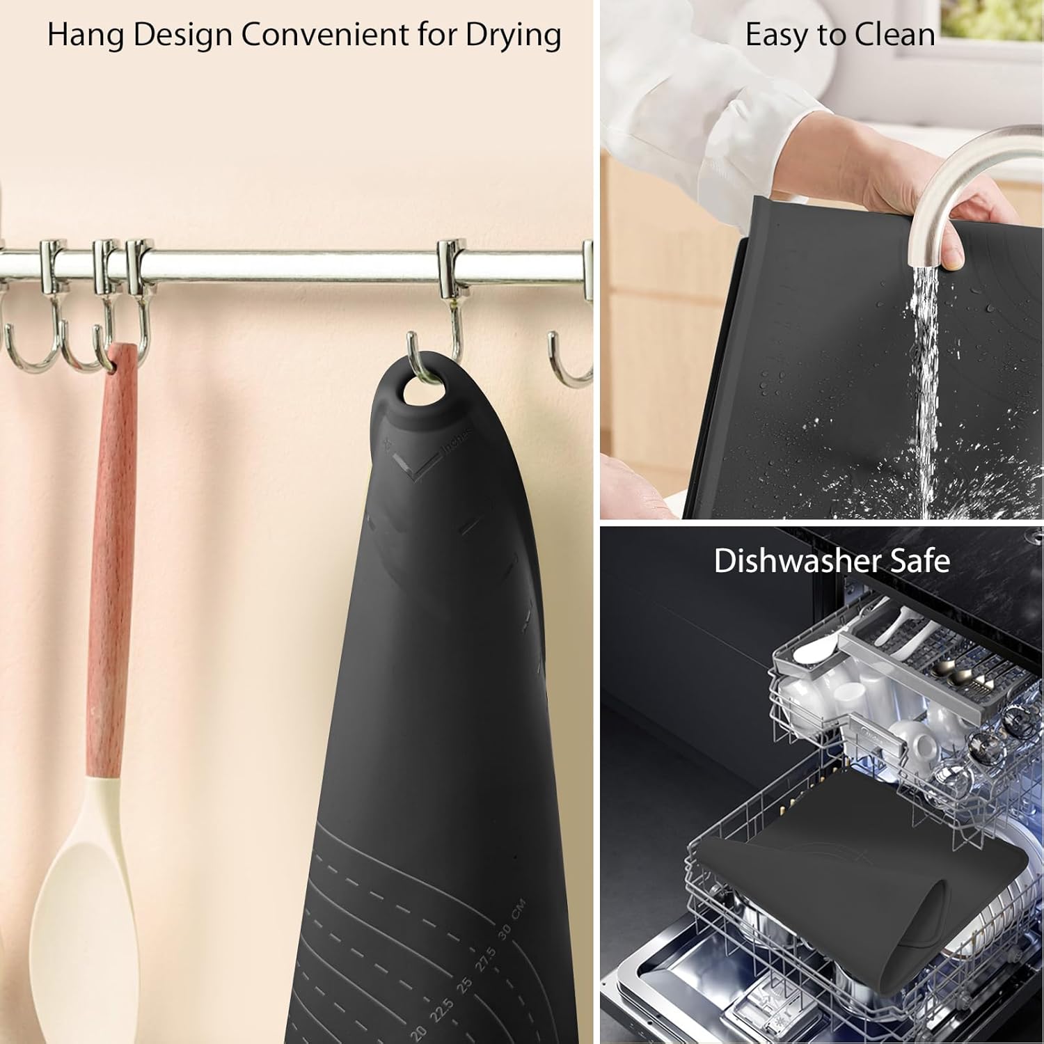 - EASY TO CLEAN AND STORAGE: Simply wash silicone pastry mat under warm soapy water and wipe clean with soft cloth. The surface will not leave residues. The side holes can be easily hung on the kitchen wall then dry itself. Every package has a cute strap, it can be rolled up or folded for easy storage and takes up very little space in drawers or cabinets.