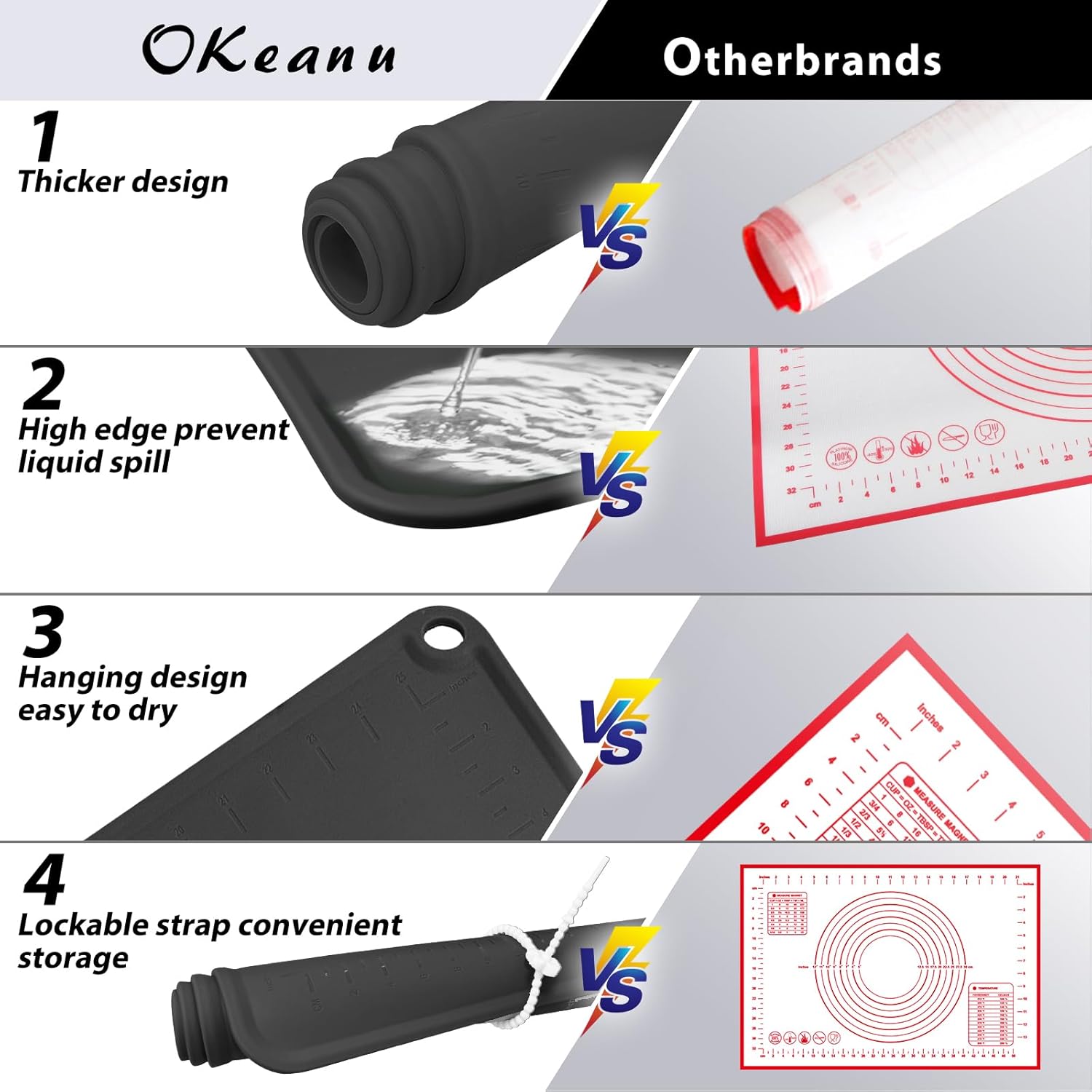 - DOUBLE THICKNESS & DURABLE MAT: The thickness silicone rolling mat is 1.5 mm and edge hightness is 4mm. The unique raised edge design can prevent the water from spilling out when you knead the dough, keep your desk clean.