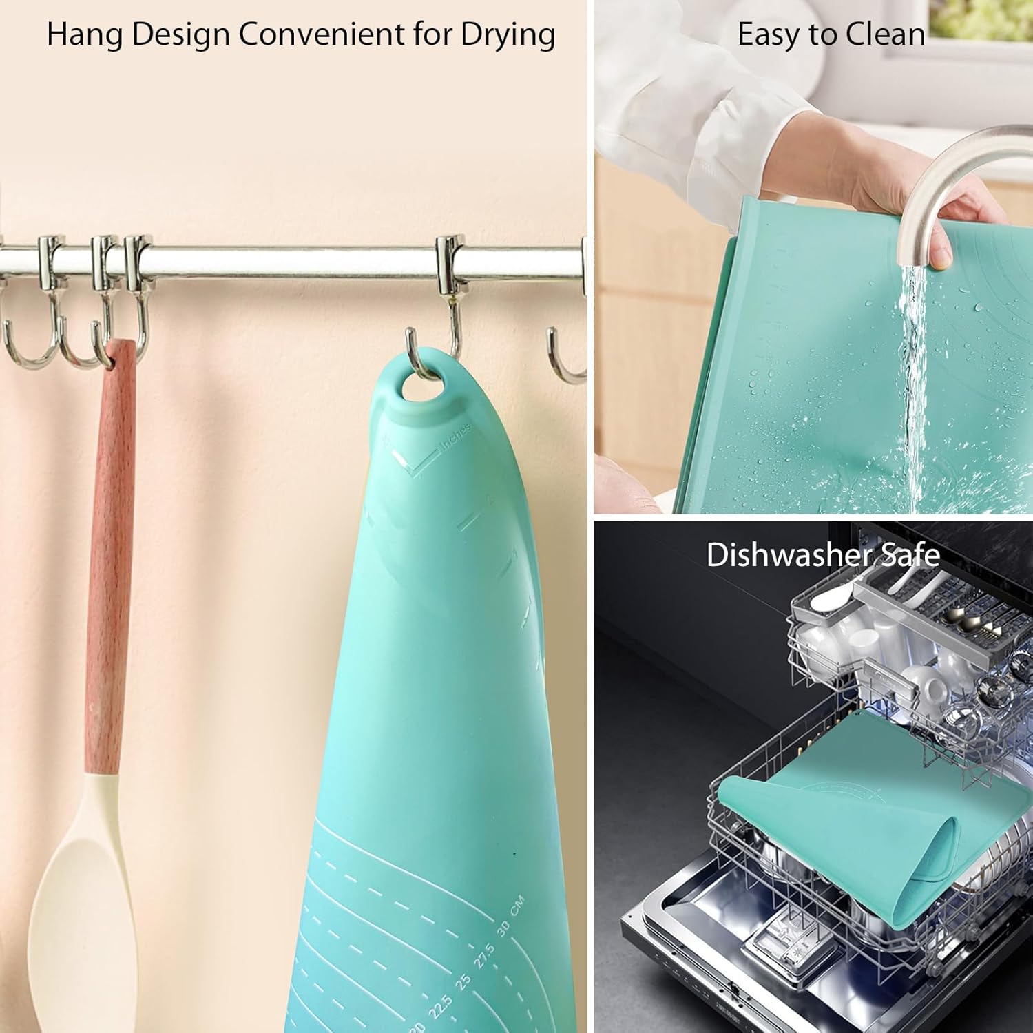 - EASY TO CLEAN AND STORAGE: Simply wash silicone pastry mat under warm soapy water and wipe clean with soft cloth. The surface will not leave residues. The side holes can be easily hung on the kitchen wall then dry itself. Every package has a cute strap, it can be rolled up or folded for easy storage and takes up very little space in drawers or cabinets.
