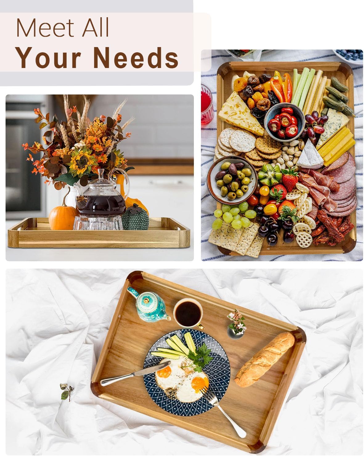 - PREMIUM ACACIA WOOD – Made from high-quality natural wood, this wooden tray is sturdy and durable. The round edges provide extra protection, while the clear paint finish makes it easy to maintain.