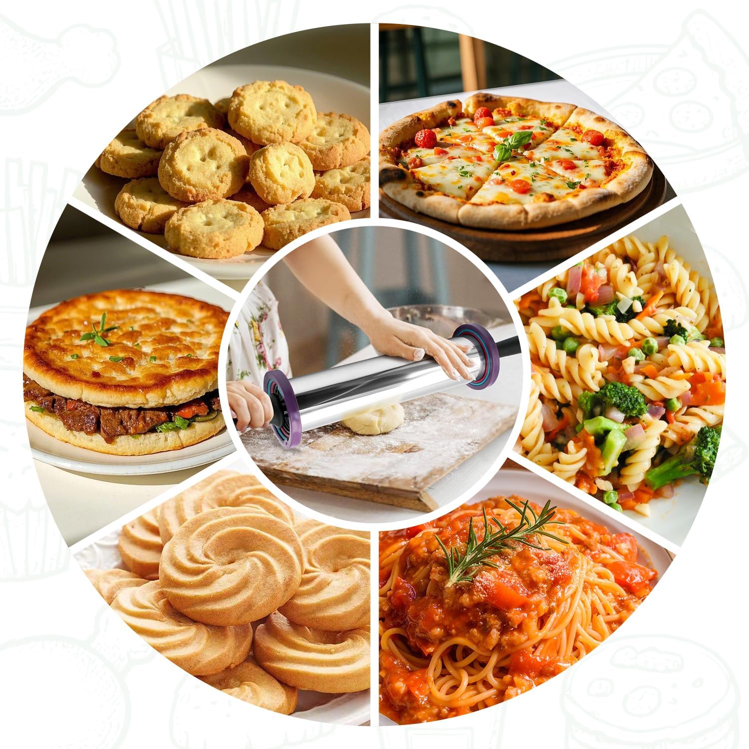 - Adjustable Rollig Pin: Adjustable Rolling Pin with Thickness Rings have 3 sizes of detachable rings: 1/2, 1/4 and 1/8 inch are used to knead the dough to the expected thickness easily of cooking. The stainless steel rolling pin in can be used to create any mixture you can imagine, such as pizza and pie, egg tart, bread, cookie, dumpling, pancake, pastry and other foods. And moreover you can teach your children to bake in the kitchen with it