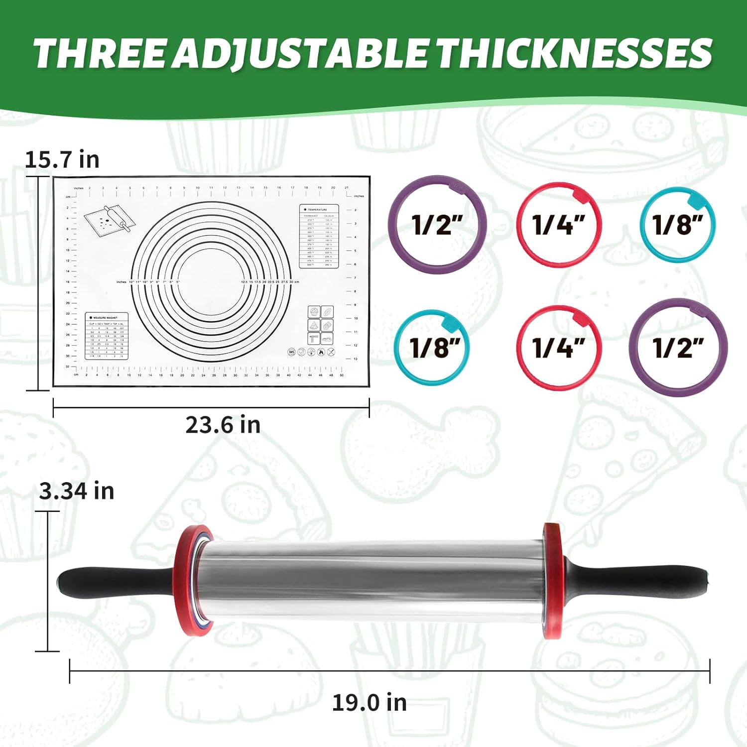 - Adjustable Rollig Pin: Adjustable Rolling Pin with Thickness Rings have 3 sizes of detachable rings: 1/2, 1/4 and 1/8 inch are used to knead the dough to the expected thickness easily of cooking. The stainless steel rolling pin in can be used to create any mixture you can imagine, such as pizza and pie, egg tart, bread, cookie, dumpling, pancake, pastry and other foods. And moreover you can teach your children to bake in the kitchen with it
