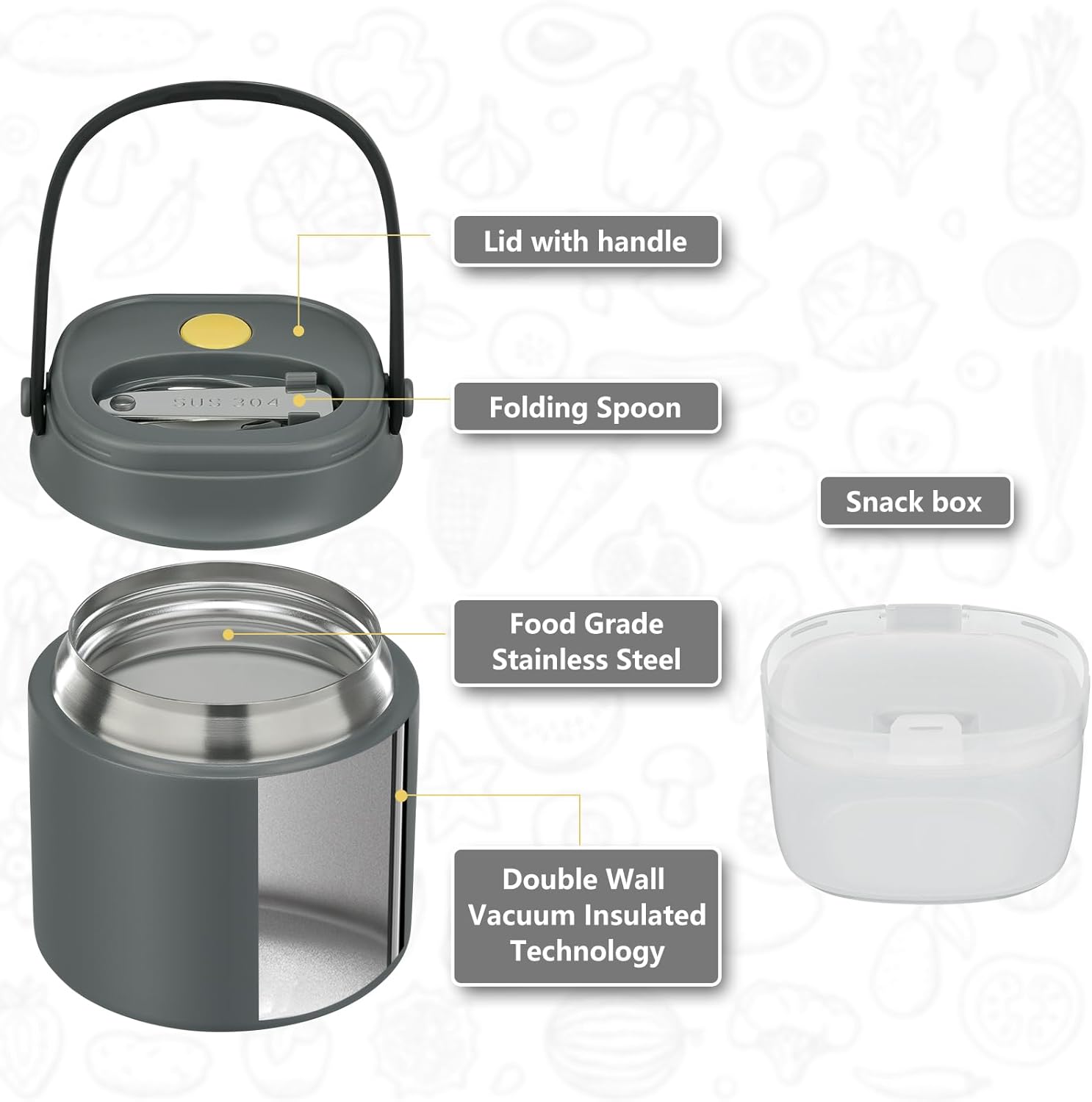 - Multi functional design - Each part of our 2-in-1 thermal food jar can be used separately, making life more convenient. The wide opening allows you to easily fill or remove food, and also makes it easier to clean the interior. Whether you want to enjoy snacks or a warm meal, this Insulated Lunch Containers offers a variety of choices for you. Recommended Age 3+.