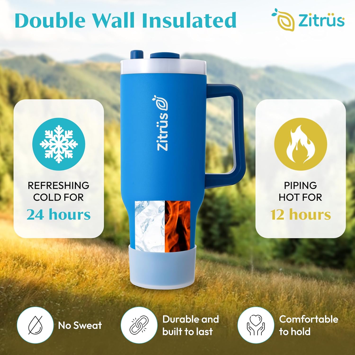 - SILENT, NON-SLIP BASE WITH SILICONE SLEEVE: Say goodbye to clinking and slipping. The Zitrüs tumbler with handle includes a durable anti-slip, anti-noise silicone sleeve, making it the perfect spill proof tumbler for hot and cold drinks. Enjoy a quieter, steadier experience on any surface—from office desks to car cup holders.