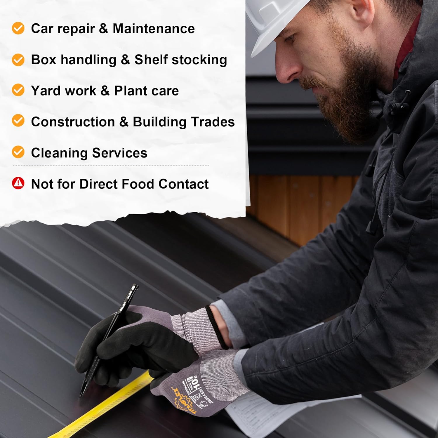 - ALL-SCENE DOMINATION: From warehouse to smart devices, touchscreen-ready nitrile grip, garden gloves for women conquers oil, grease, and dust while operating devices. Lightweight + quick-dry for logistics, cleaning, and assembly. Certified unisex sizing (S-XXL), great summer work gloves for men, gardening gloves for women.