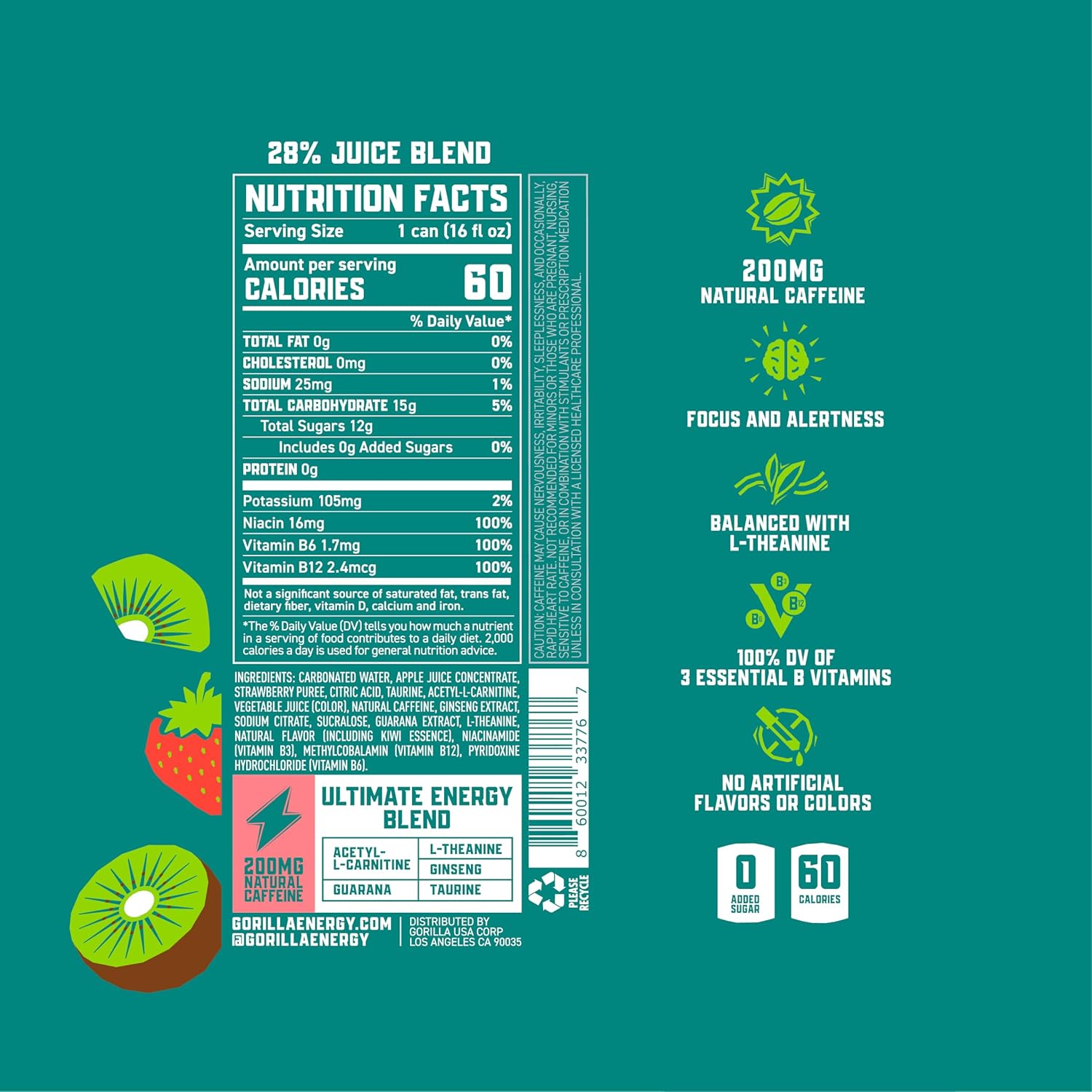 Gorilla Energy Drink, Kiwi Strawberry, 200mg Natural Caffeine, Real Fruit Juice Squeezed & Concentrated, L-Theanine, Taurine, Ginseng, Acetyl L-Carnitine, No Added Sugar and No Artificial Colors, 12 Pack
