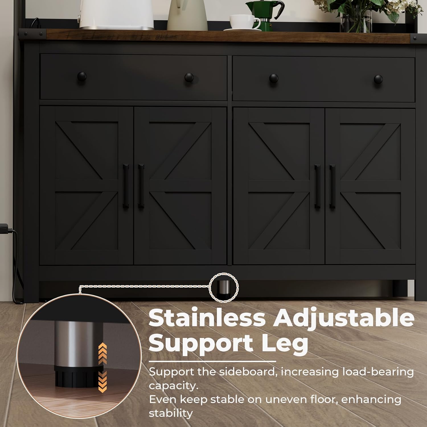 Hutch Storage Cabinet Buffet with Drawers, and Charging Station, Coffee Bar Cabinet with Barn Doors, Wine Rack and Hooks, Countertop, Long Farmhouse, Black, for Kitchen, Dining Room, 54.1" High