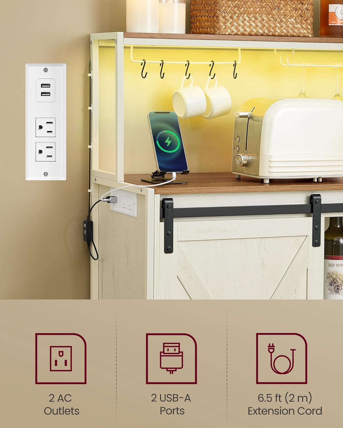 VASAGLE Coffee Bar Cabinet with Power Outlet and Voice Control LED Light, Buffet Cabinet with Sliding Barn Doors, S Hooks, Wine Glass Racks, Bottle Holders, Rustic White and Honey Brown ULSC201W01