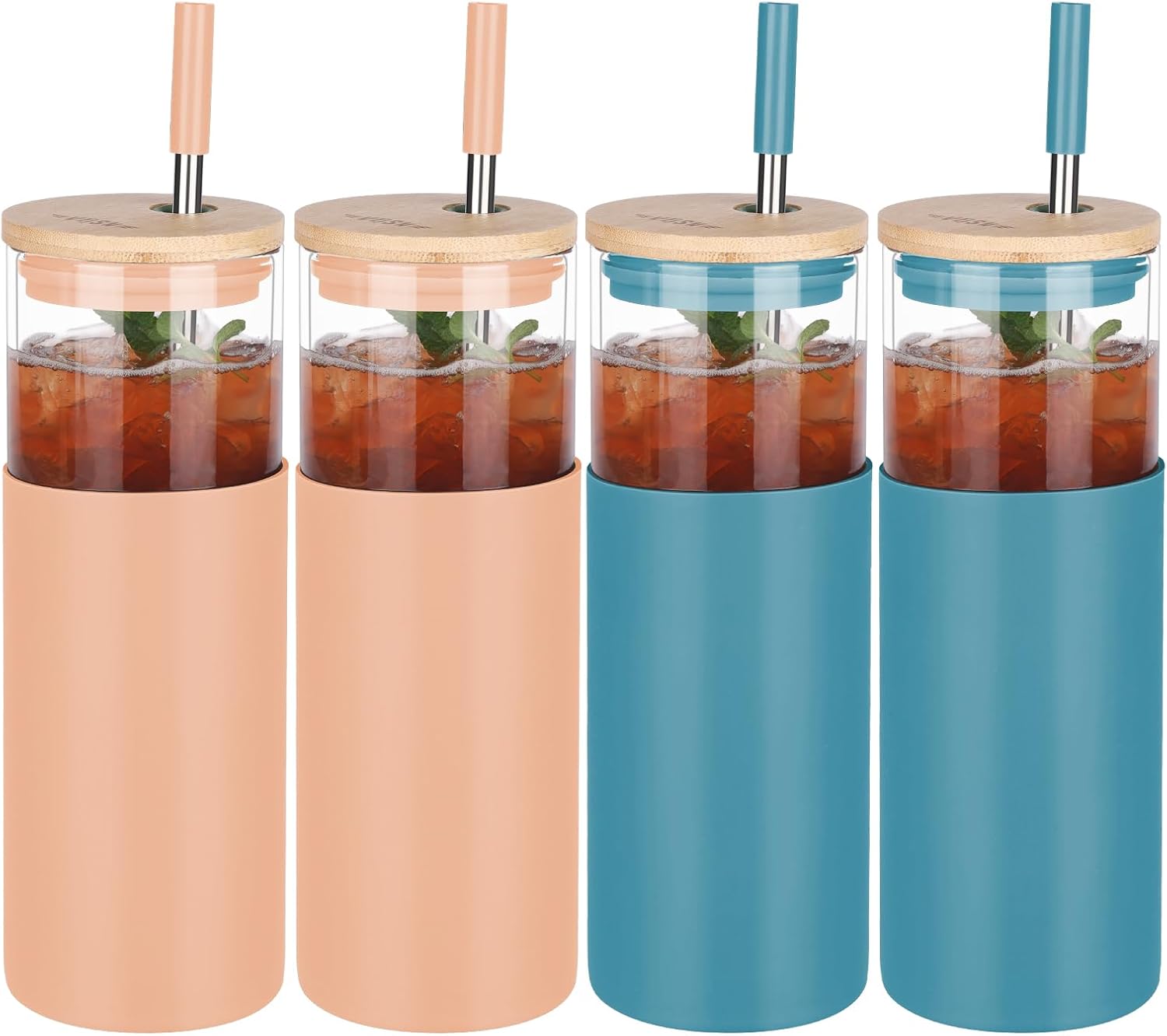 Glass Tumbler w/Lids & Straw - 24oz Reusable Mug w/Bamboo Lid & Stainless Steel Straw - BPA-Free, Leak-Proof, Dishwasher Safe for Coffee, Smoothies, Hot Beverages, Travel, Office, Home Use,4-PK