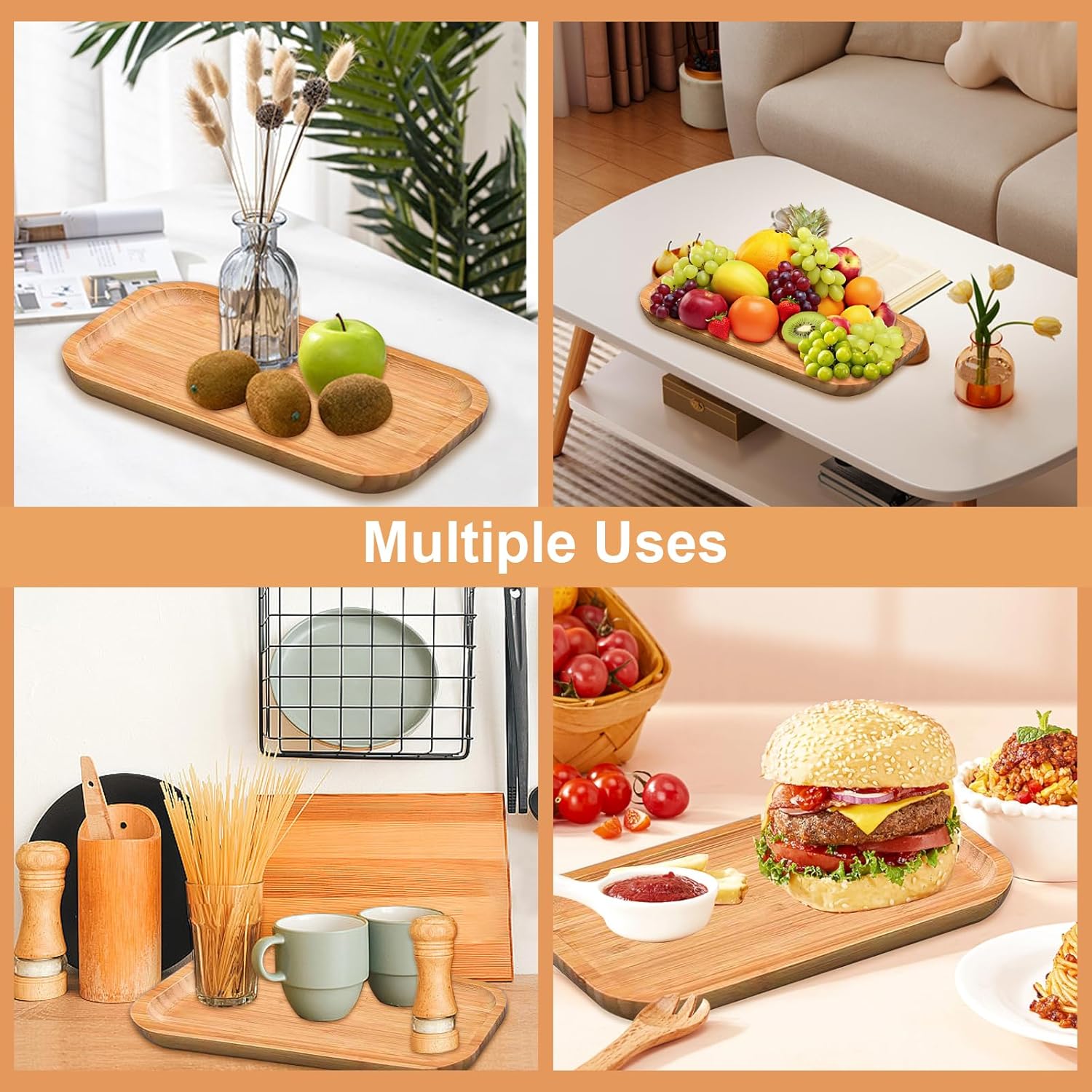 - Unique Design: The raised edges of the bamboo tray prevent food from slipping or spilling,while also protecting your furniture surfaces from damage.You can place different foods,such as coffee, fruit,or snacks.