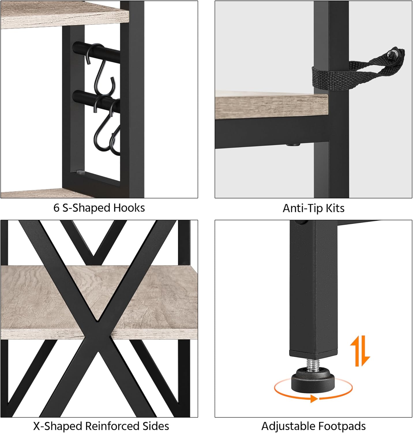- X-design Metal Frame: The X-shaped sides not only add a unique touch to the kitchen rack's appearance but also enhance its overall strength and stability, making it a reliable storage solution