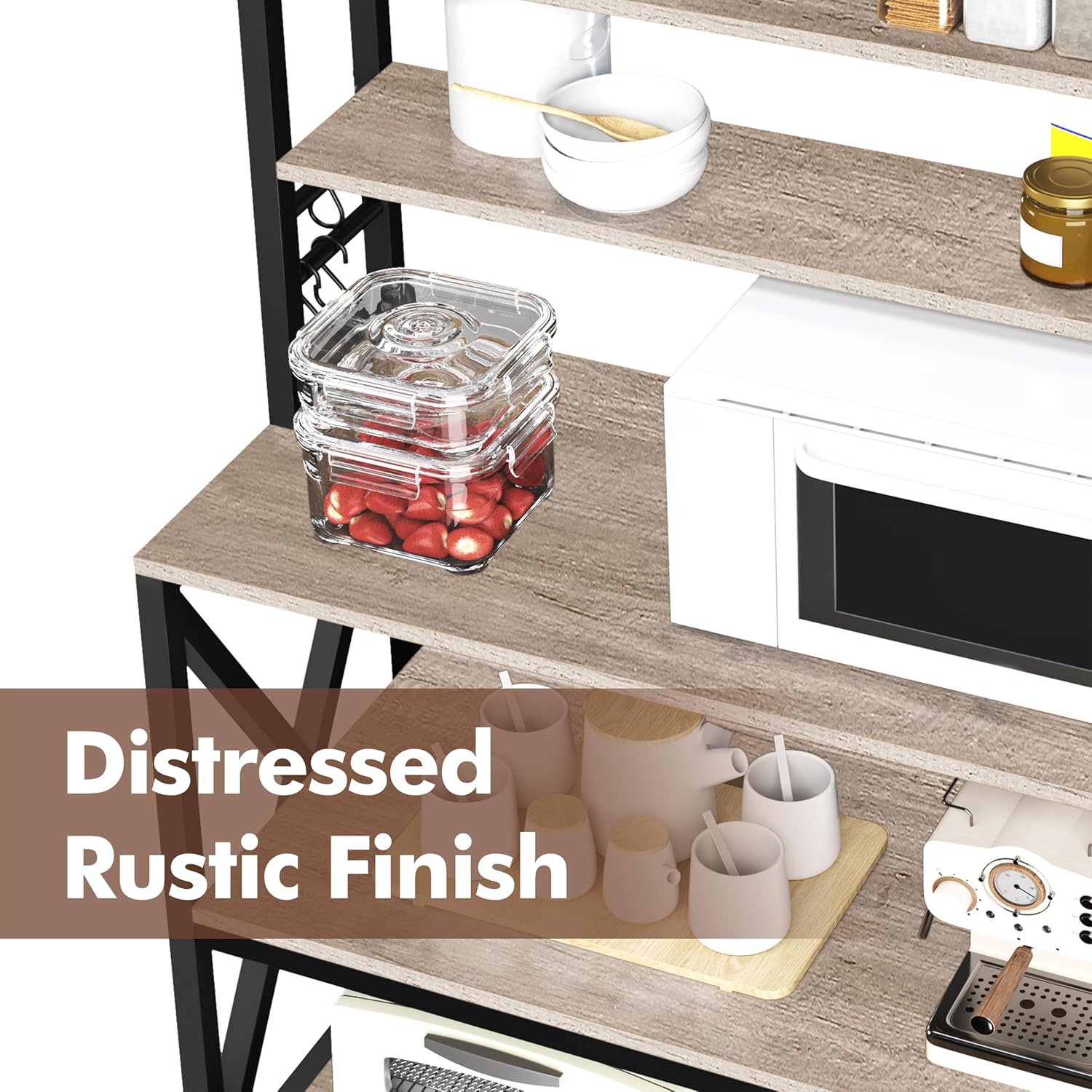 - Functional Shelving & Hooks: This baker’s rack features three small shelves for jars and spices, three large shelves for microwave and kitchenware, and six hooks for towels and kitchen gloves, offering exceptional functionality