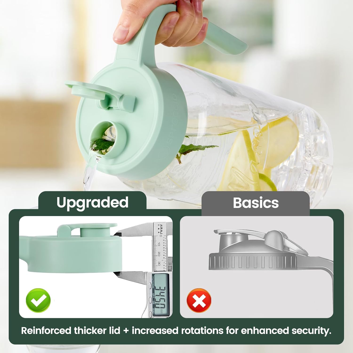 - Effortless Pouring Glass Pitcher with Lid: Enjoy effortless pouring with the wide-mouth flip-cap spout and non-slip handle. Say goodbye to unwanted spills and mishaps, as our lid pops open to ensure your content won't leak or spill.