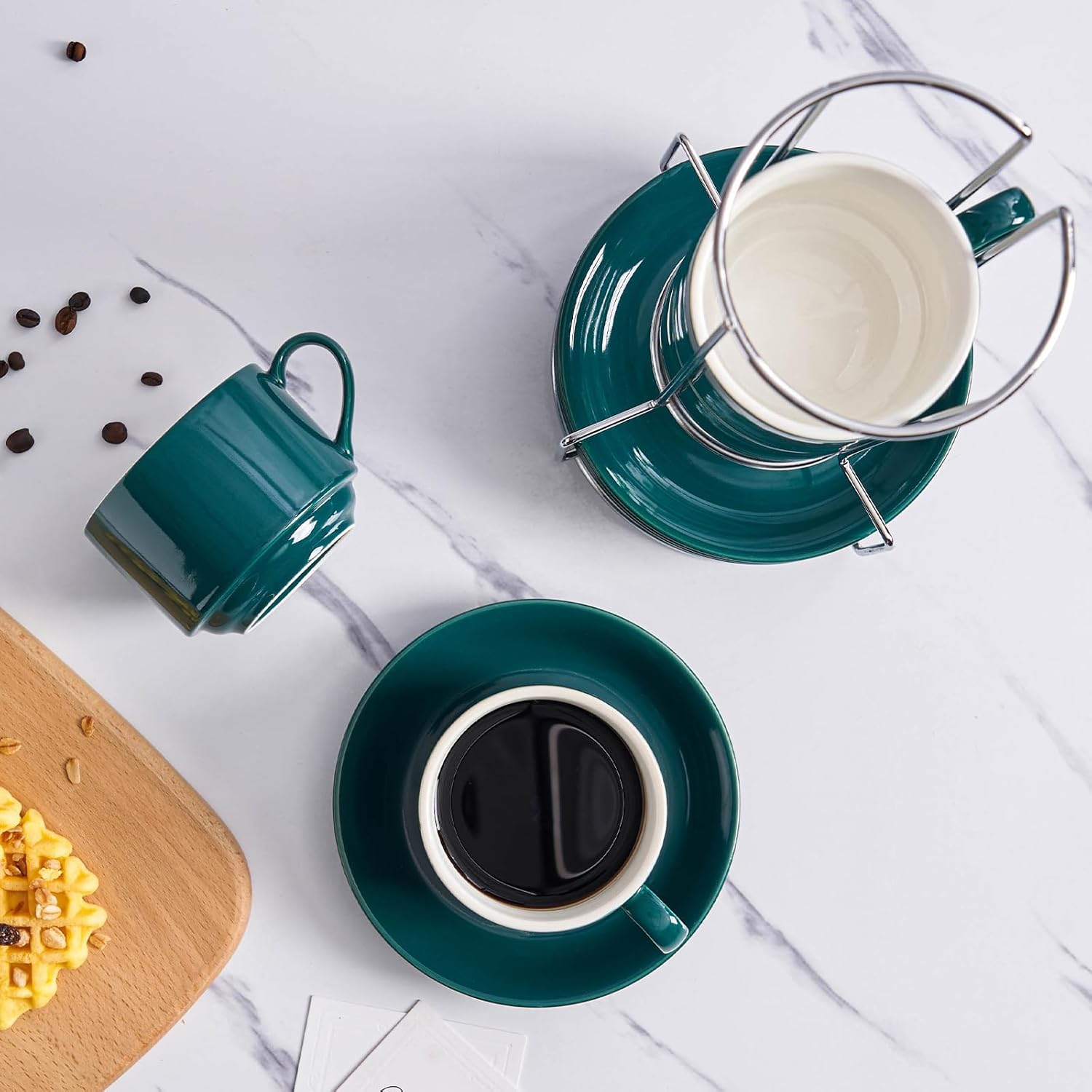 - The cups and saucers can be stacked neatly on the metal stand for easy organization, keeping your coffee corner clean and tidy. Say goodbye to clutter and embrace the simplicity of an organized life.