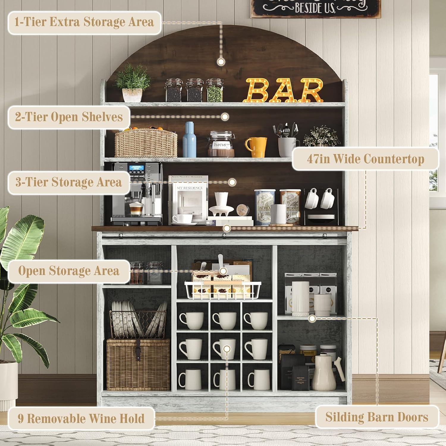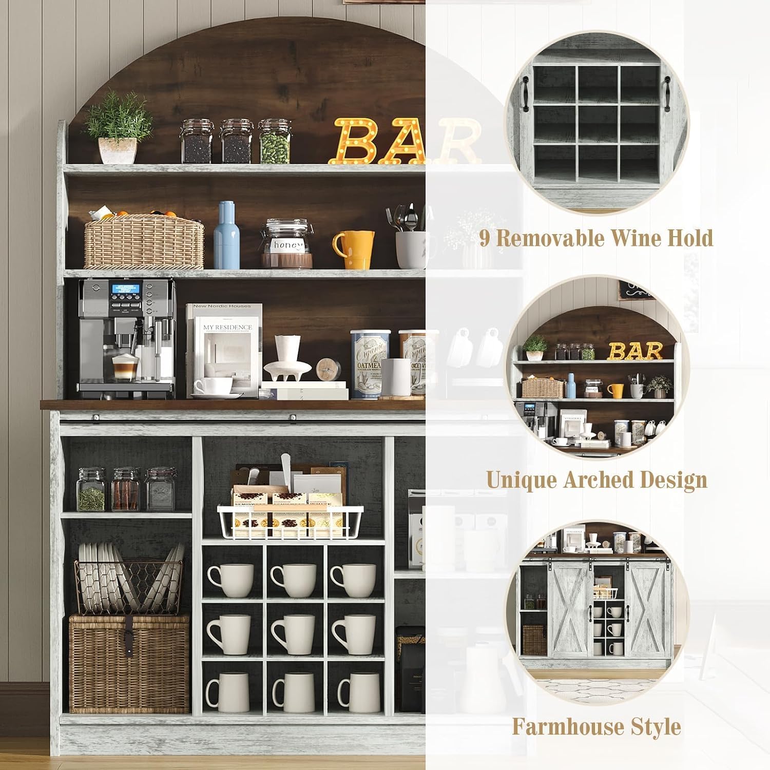 4 EVER WINNER Coffee Bar with 3-Tier Storage, 67" Coffee Bar Cabinet with Sliding Barn Doors & Wine Rack, Kitchen Hutch Cabinet for Living Room, Dining Room, Grey