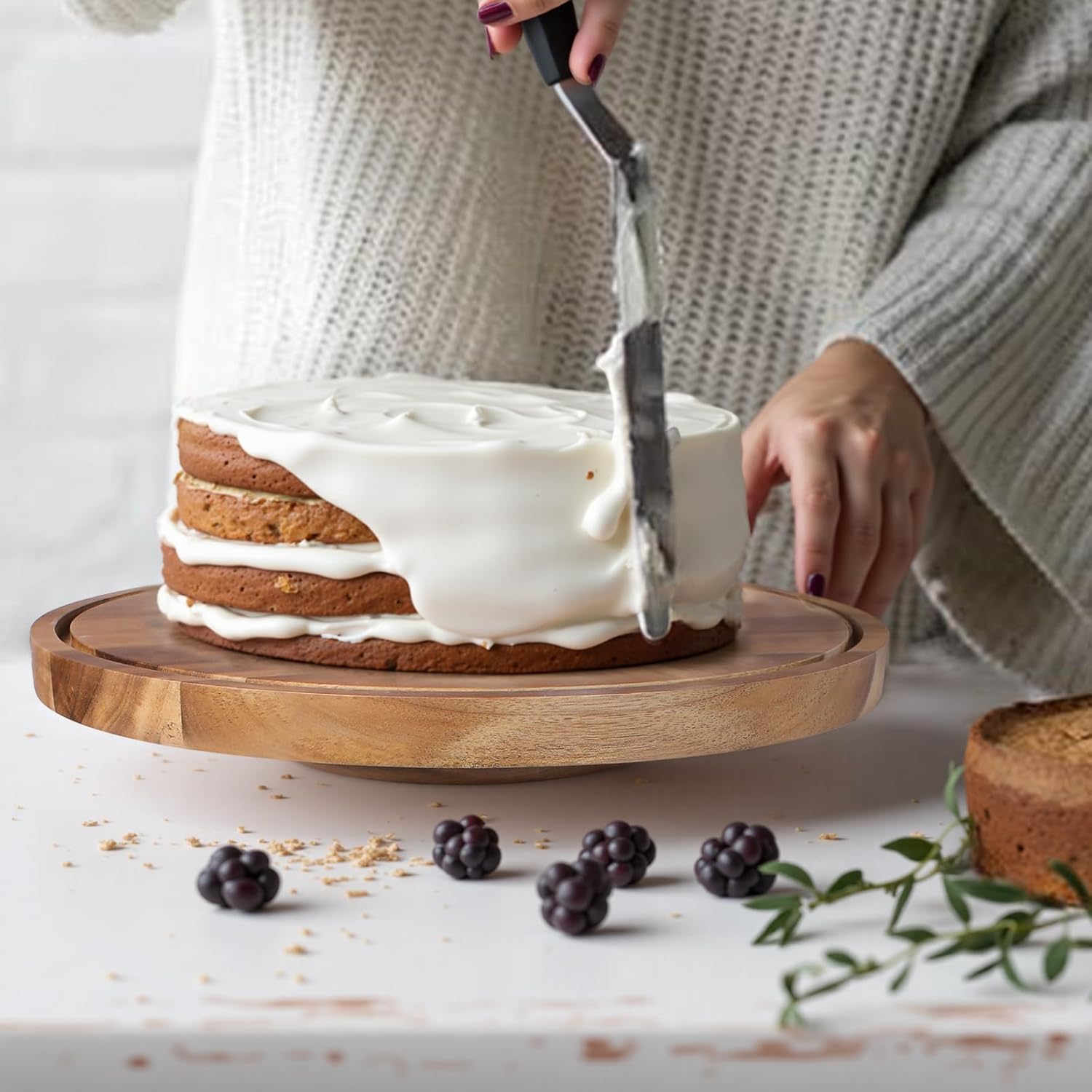 - 【Elegant and Smooth】This rotating cake stand adds a touch of sophistication to any event, from indoor gatherings to outdoor parties. Its buttery-smooth rotation showcases your desserts with effortless grace, while the refined acacia wood grain elevates your table decor. Perfect for displaying cakes, pastries, or appetizers in style!