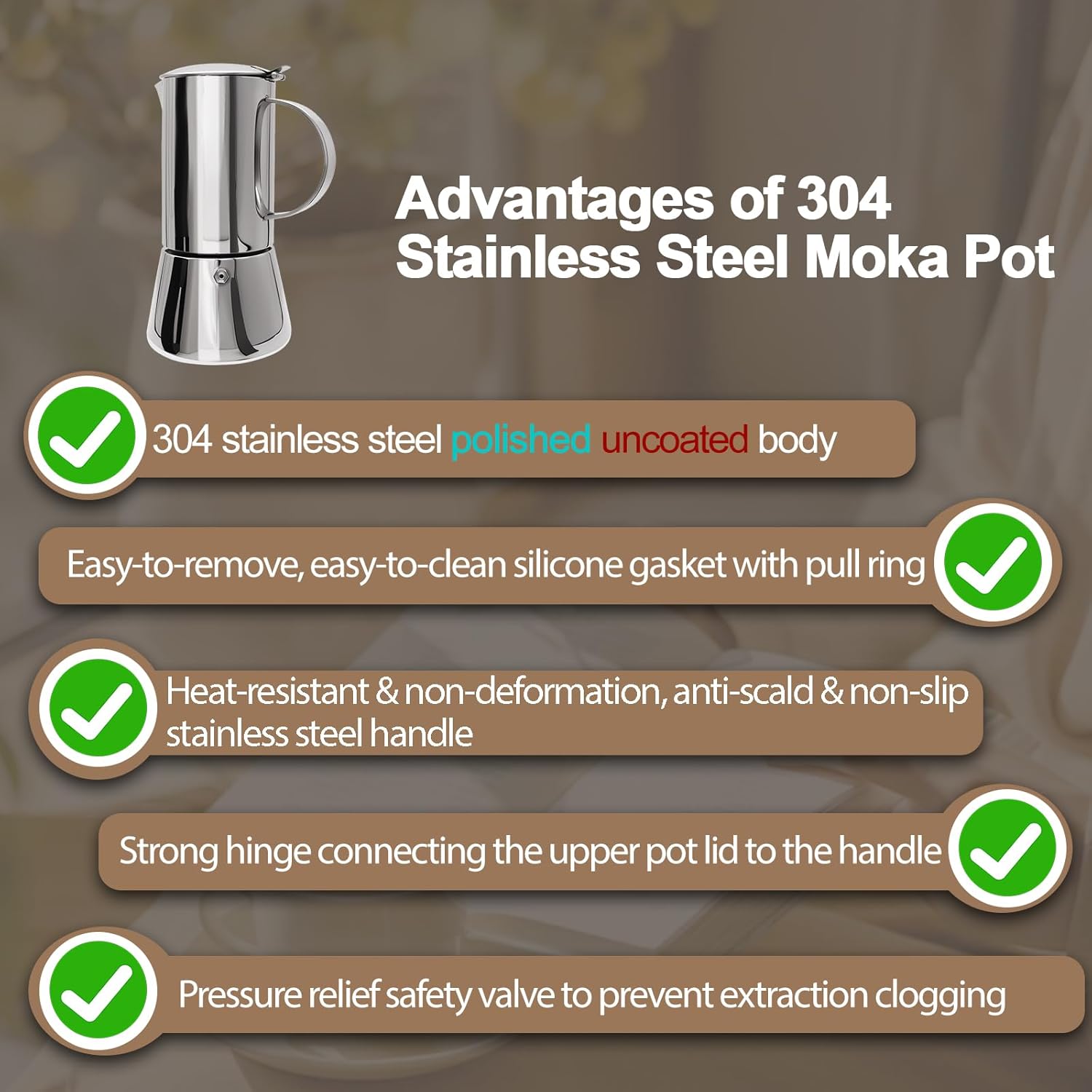 - Uncoated 304 Stainless Steel Material: Made of thickened 304 stainless steel with an uncoated fine polish finish for a smooth and bright appearance. With excellent heat conductivity and durability, it is not easy to be deformed or damaged, and can be used for a long time and repeatedly cleaned, greatly extending its service life. It also absorbs and transfers heat to the pot quickly and evenly, and is compatible with most stoves, ensuring that the coffee extraction process is efficient and stable, and every drop is full of mellow flavor