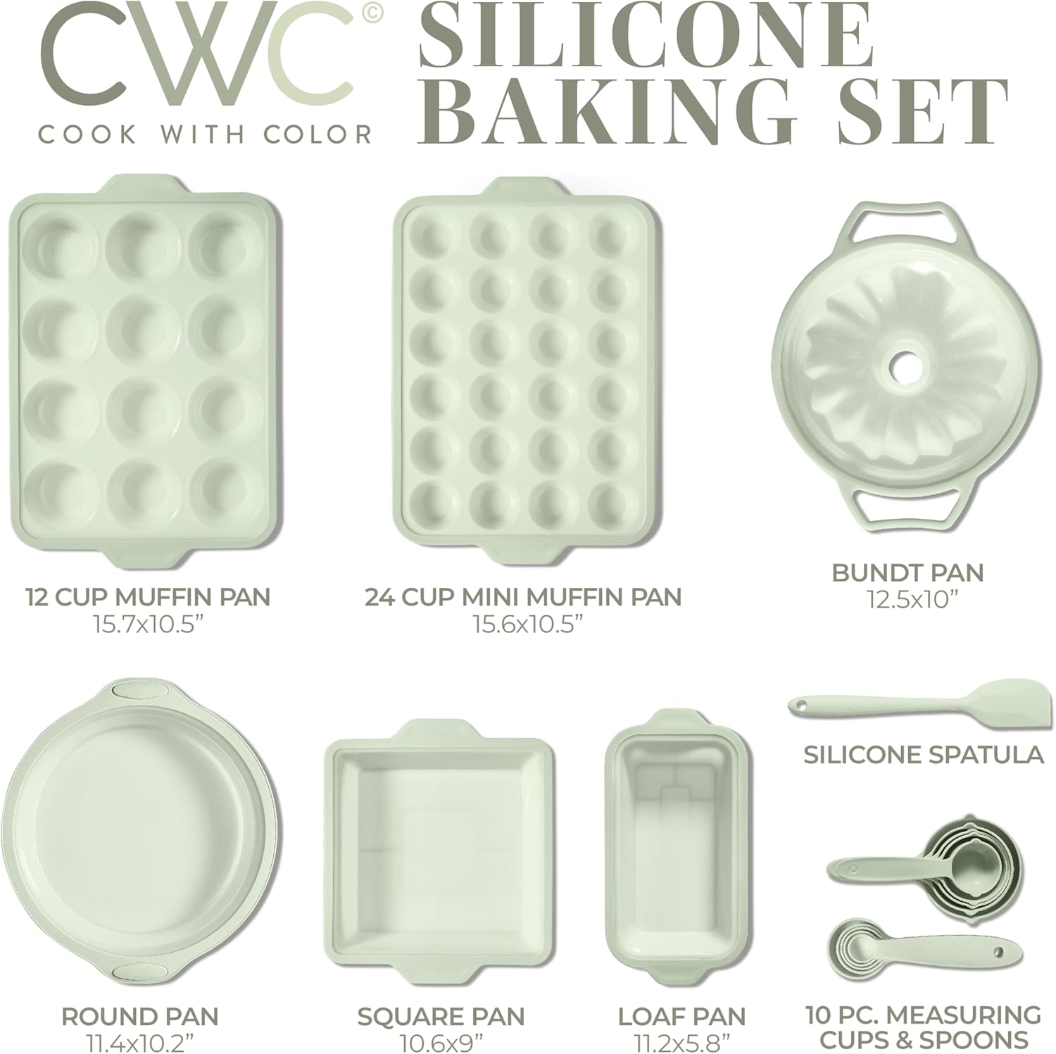 - Complete Baking Set: This silicone baking set with silicone bundt pan, comes with everything you need. It's the perfect addition for bakers looking to expand their silicone bakeware collection. Includes: 12 cup silicone muffin pan, 24 cup mini muffin pan, bundt pan, round cake pan, square pan, loaf pan, silicone spatula and measuring cups and spoons.
