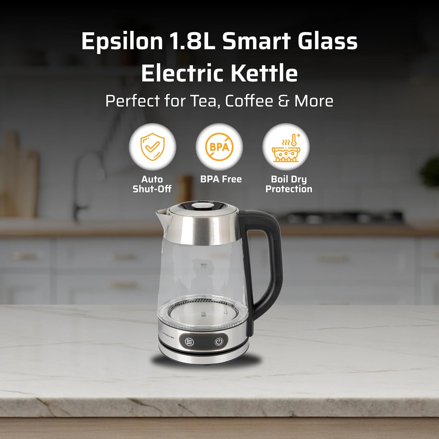 Epsilon 1.8L Glass Electric Kettle – Hot Water Tea Kettle with Borosilicate Glass & Stainless Steel, Auto Shut-Off, Fast Boil 1500W Electric Teapot, BPA-Free, Cool Touch Base