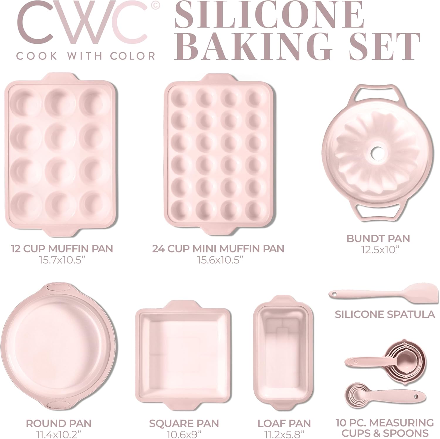 COOK WITH COLOR 17 Pc. Silicone Baking Pan Set - Non-Stick & Easy Clean Silicone Muffin Pans for Baking with Sturdy Metal Frame for Stability, Flexible Cake Molds, Includes Measuring Cups and Spoons