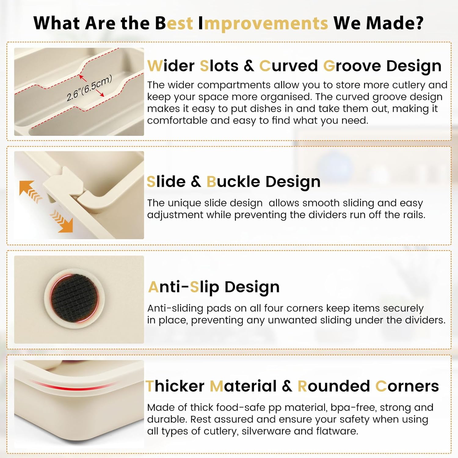 - Non-skid Silicone Feet: 8 strategically placed non-slip feets (not just four corners!) create superior grip on drawer surfaces. No more worrying about the flatware tray moving or tilting when you pull out the drawer.