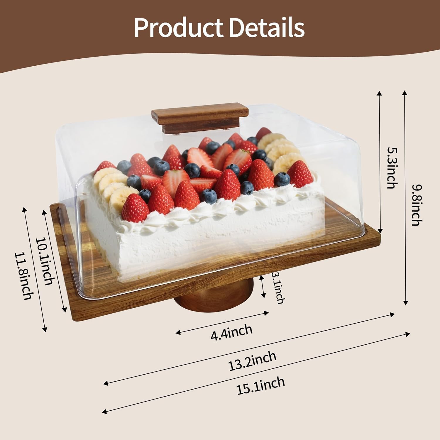 Wood-Rectangular-Cake-Stand with Acrylic Dome Lid, Wooden Cake Holder Plate with Cover, 2-in-1 Dessert Table Display Set for Party, Charcuterie Board for Cheese, Chips & Dips, Nachos, Fruit Platter