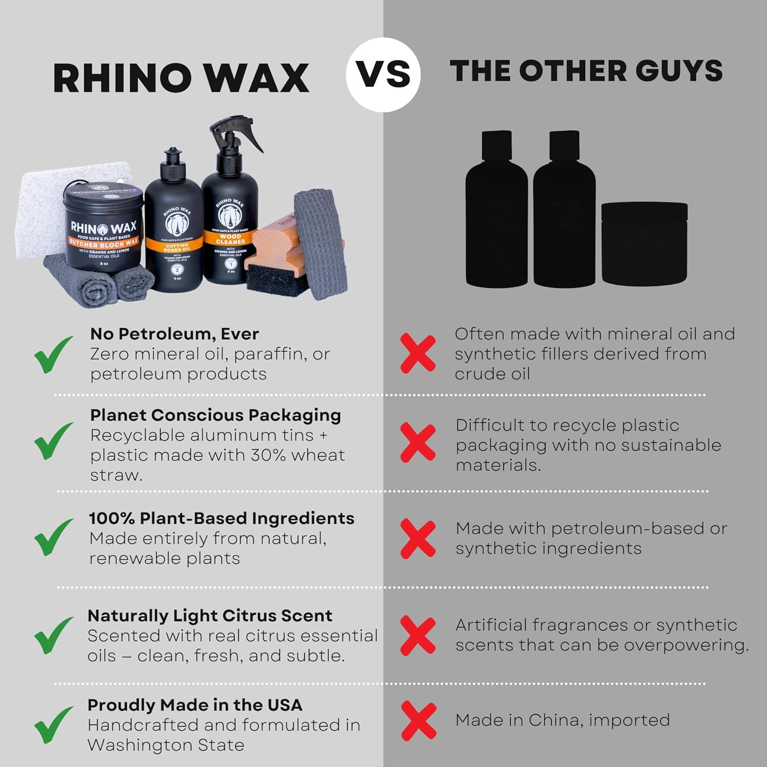 - Visible Results: Regular use of the Rhino Wax Butcher Block Maintenance Kit ensures the quality and beauty of your wood cutting boards, butcher blocks and kitchen tools