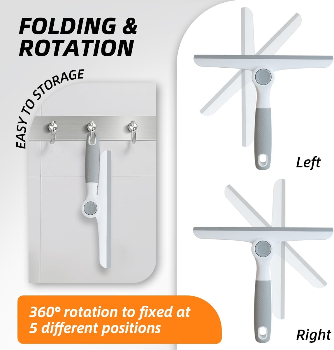 - 【360° Rotating Window Squeegee】The head of shower squeegee for glass doors can be fixed at 5 different angles making cleaning easier, that can be folded for storage after cleaning. With this window squeegee for home, you can quickly tidy up the window, shower door, marble counter, foggy mirrors, car windshields etc.
