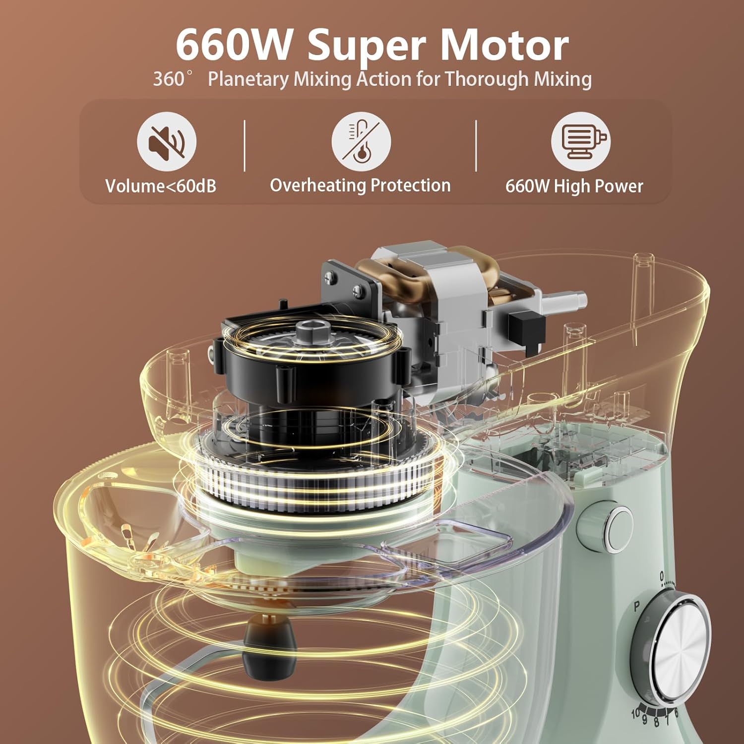 - 660W POWERFUL DYNAMICS - Powered by a precision-engineered 660W motor with copper-core technology, this mixer delivers high-torque performance . Its smart energy algorithm reduces power consumption by 35% compared to conventional models. The dual-cooling system ensures continuous 1-hour operation without overheating.