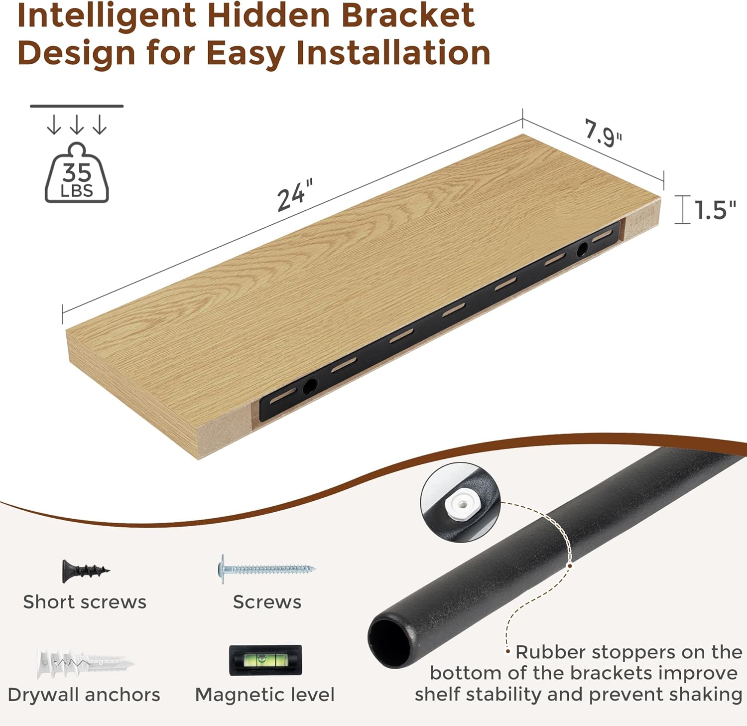 - 【Easy To Install】This oak floating shelves not only come with stainless-steel galvanized invisible brackets, but also equipped a fixing screw at the bottom to fix the shelf on the support rod, which solves the problem of sliding and is not easy to damage, and can be used for a long time. Instructions, magnetic level, drywall anchors, and screws included.