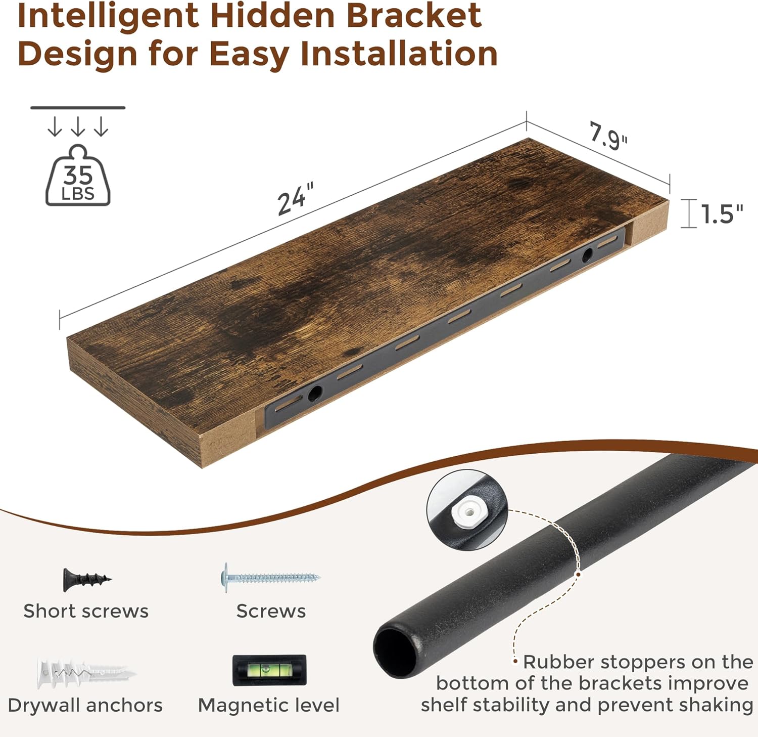- 【Easy To Install】This rustic brown floating shelves not only come with stainless-steel galvanized invisible brackets, but also equipped a fixing screw at the bottom to fix the shelf on the support rod, which solves the problem of sliding and is not easy to damage, and can be used for a long time. Instructions, magnetic level, drywall anchors, and screws included.