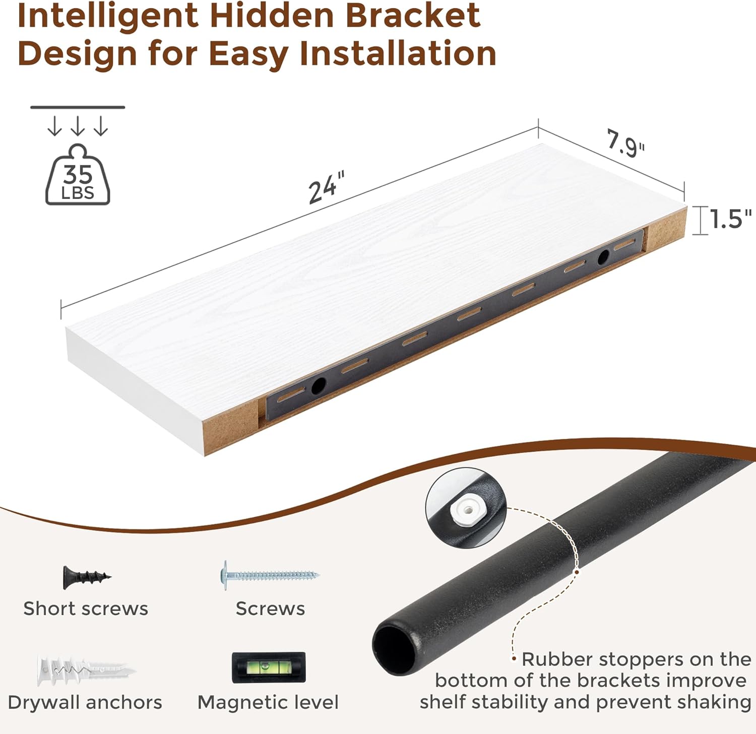 Heimlove 24 Inch Floating Shelves for Wall White Shelves Set of 2,Wall Mounted Rustic Wood 8 Inch Deep Floating Shelf with Invisible Brackets for Bedroom Kitchen Living Room