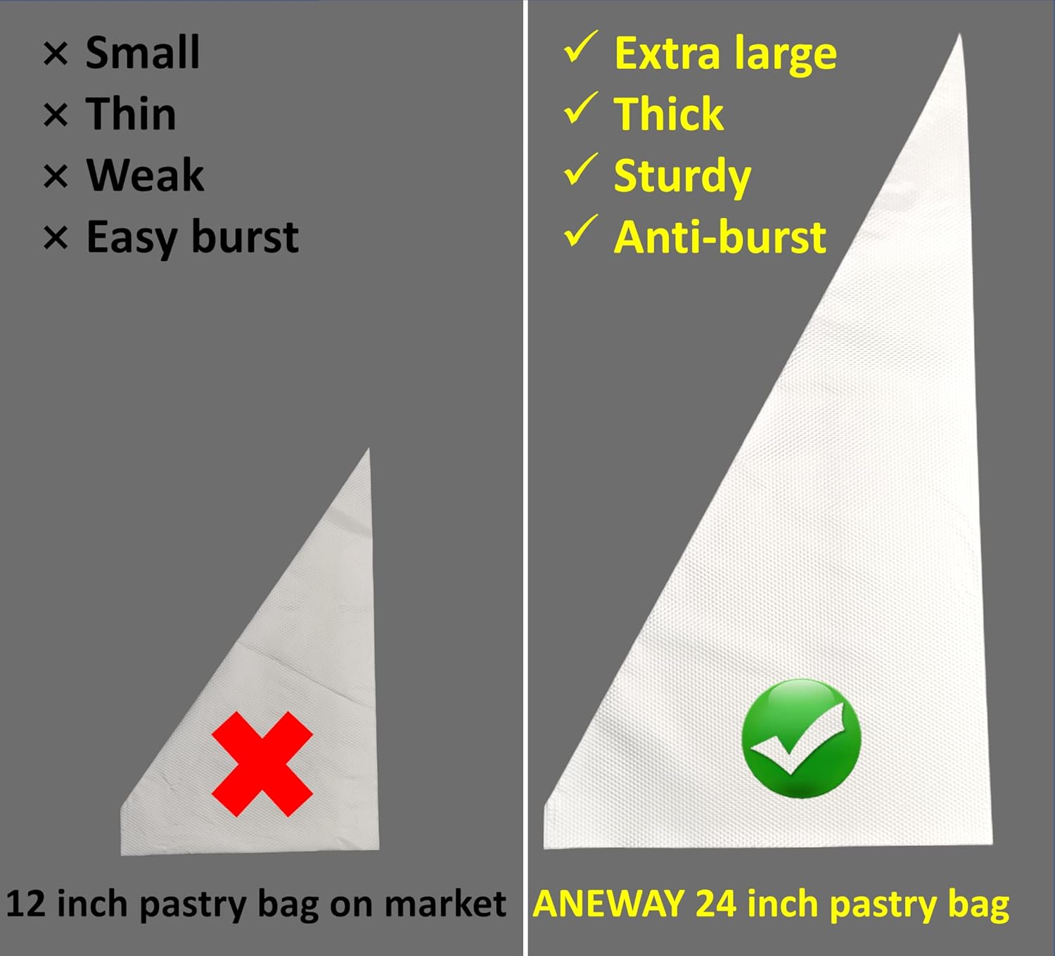- 【 Extra Large Pastry Bags】:These 24 inch large piping bags have larege capacity that can hold 2.5 Liters volume as measured in water(while the mainstream product in the market 12 inch and 16 inch can only hold 0.3 and 0.6 liters respectively).No switching bags constantly, the large size saves your time and money.Enjoy icing,frosting without interrupting