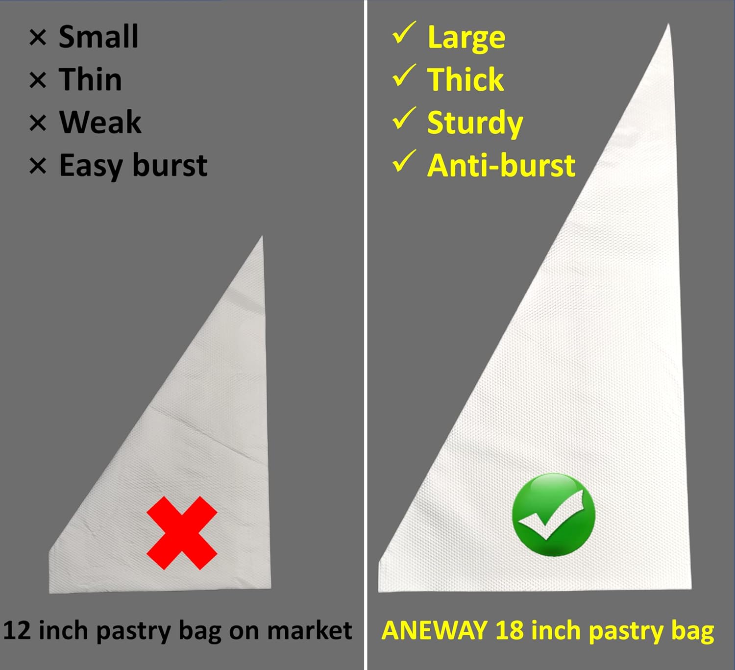 - 【Large Pastry Bags】:These 18 inch large piping bags have larege capacity that can hold 1 Liters volume as measured in water(while the mainstream product in the market 12 inch and 16 inch can only hold 0.3 and 0.6 liters respectively).No switching bags constantly, the large size saves your time and money.Enjoy icing,frosting without interrupting
