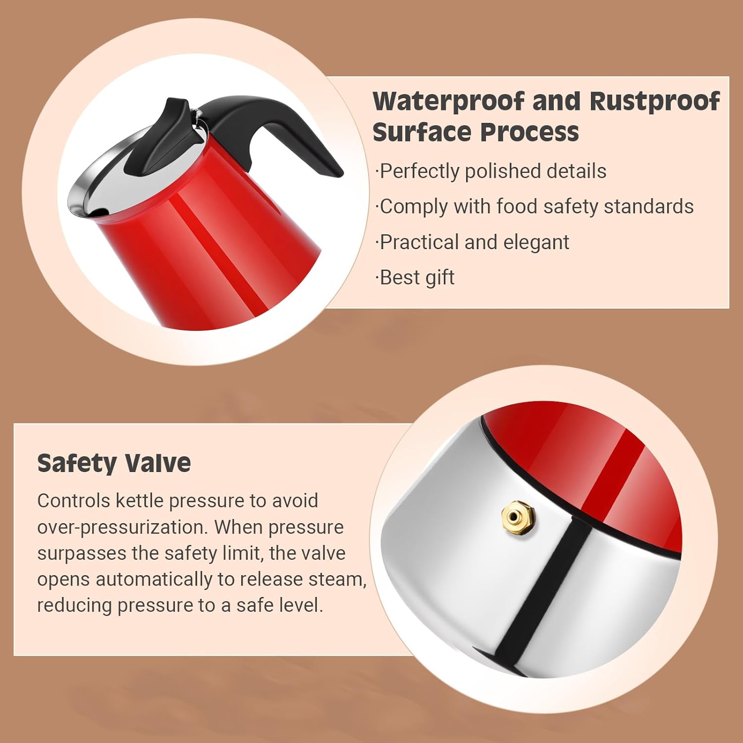 - SIMPLE OPERATION: Fill lower pot with water below safety valve. Add grounds to the funnel and tighten the upper and lower pots. Heat on low 3 to 5 mins until gurgling, your moka pot espresso is done