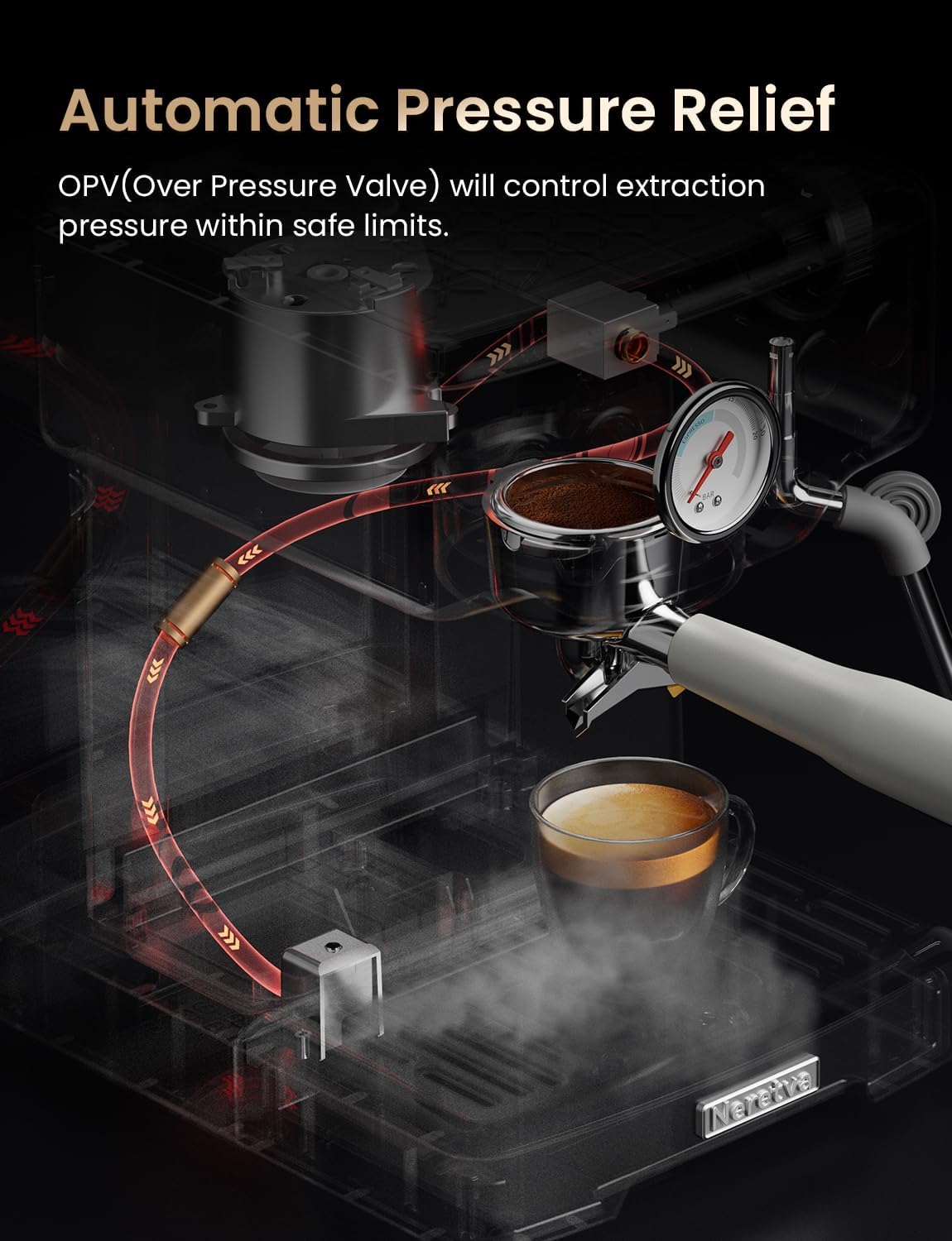 - AUTOMATIC PRESSURE RELIEF - The espresso makers have a built-in OPV (Over Pressure Valve), which serves to open automatically when the pressure is too high, releasing the excess pressure to maintain the taste and quality of the coffee. At the same time, it prevents the boiler from being over pressurized and damaged the next time it is turned on to heat.