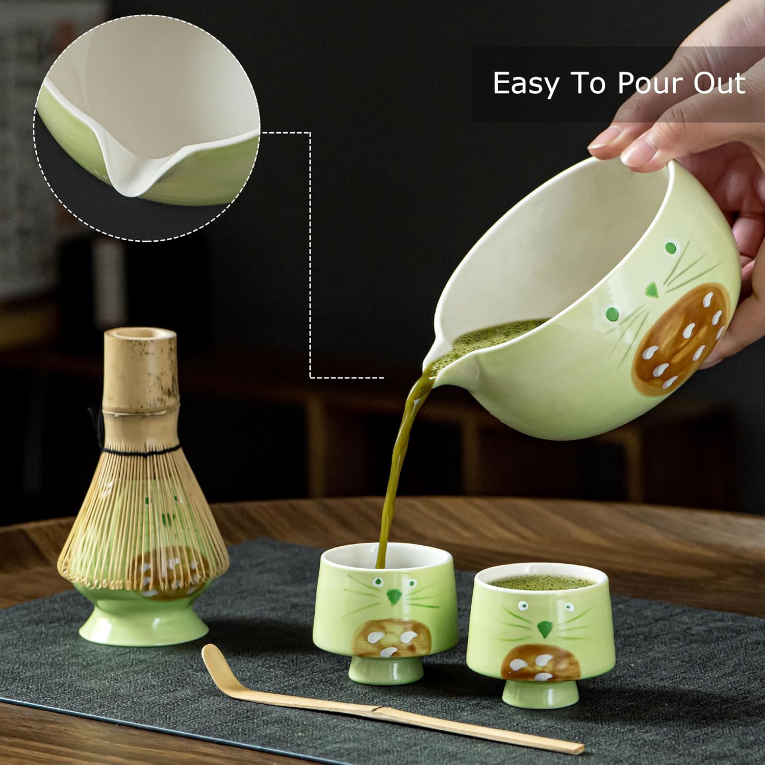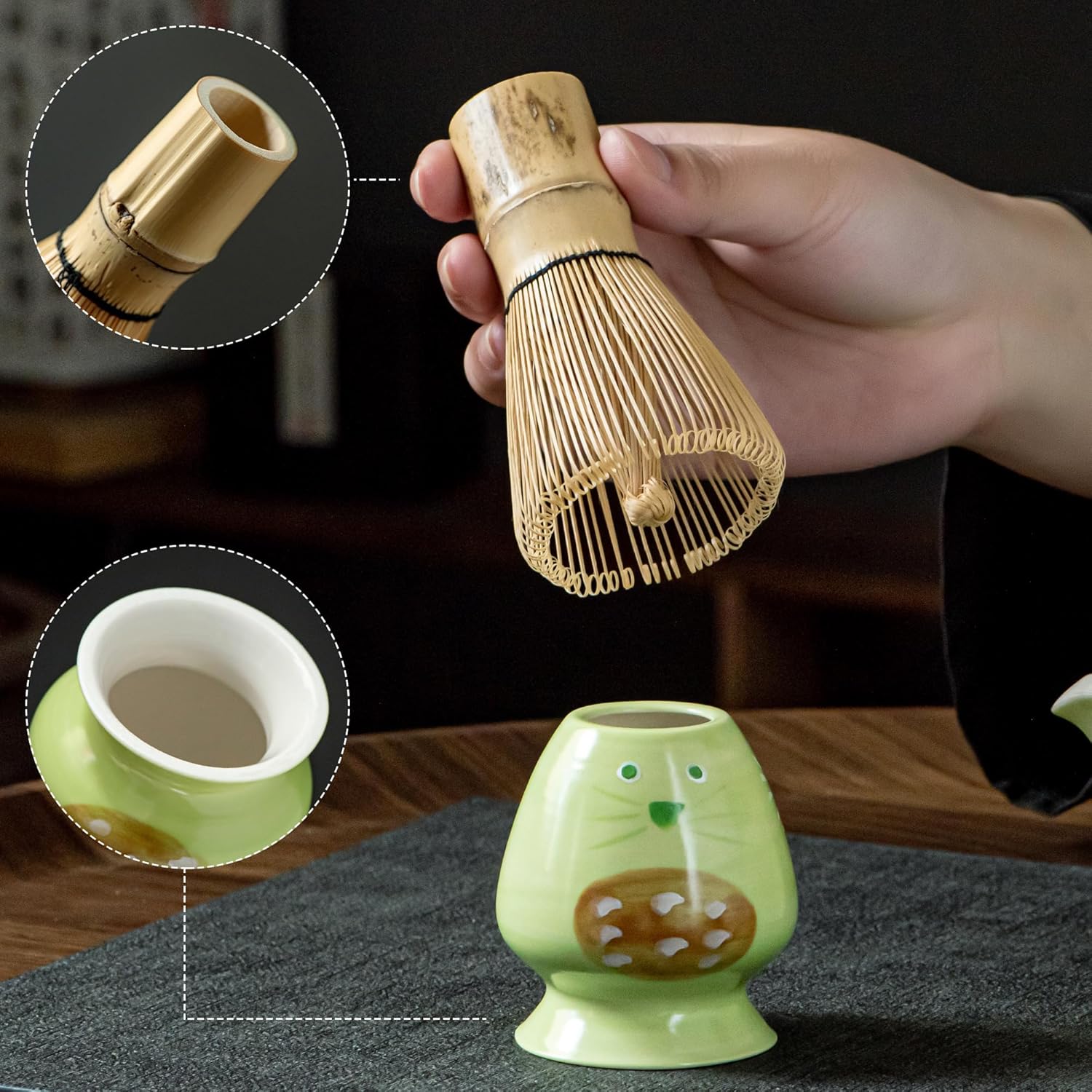 Green Matcha Set -Cute Cat Matcha Kit Includes Ceramic Bowl, Whisk and Holder, Bamboo Scoop - 6 Pcs Matcha Whisk Set for Matcha Lovers